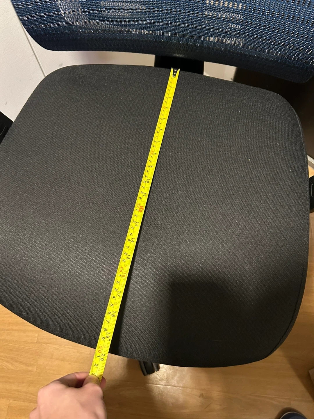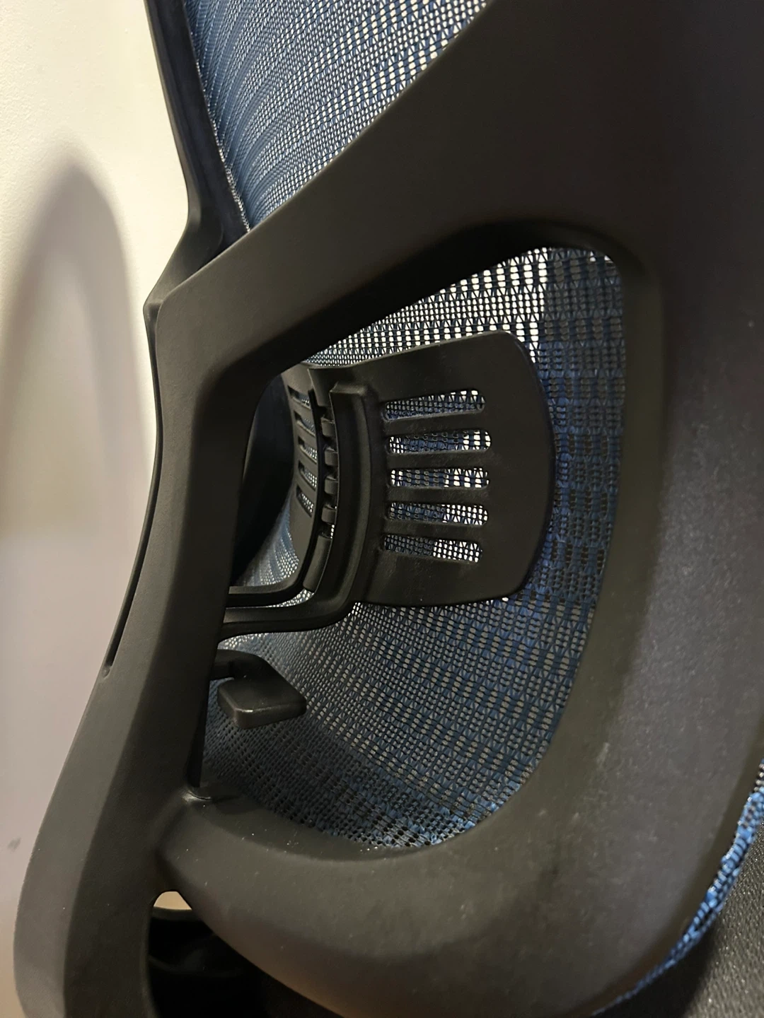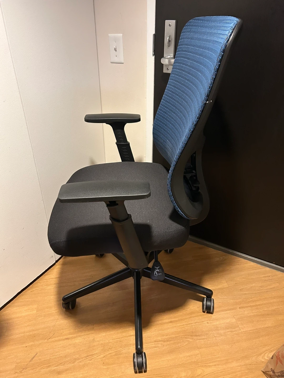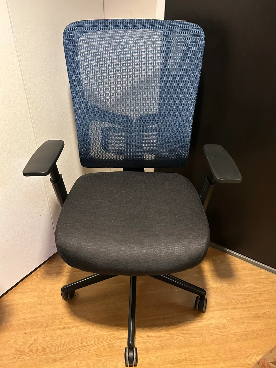 This is an ergonomic office chair with a breathable blue mesh back and a padded black seat. It features adjustable armrests and levers for height and back rest adjustments. It has a large seat cushion! In excellent condition.