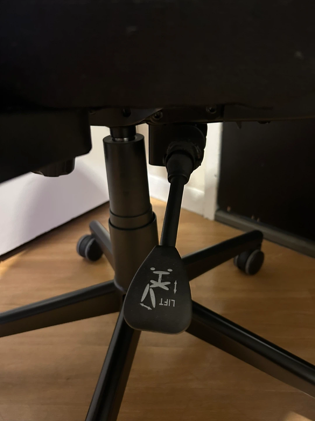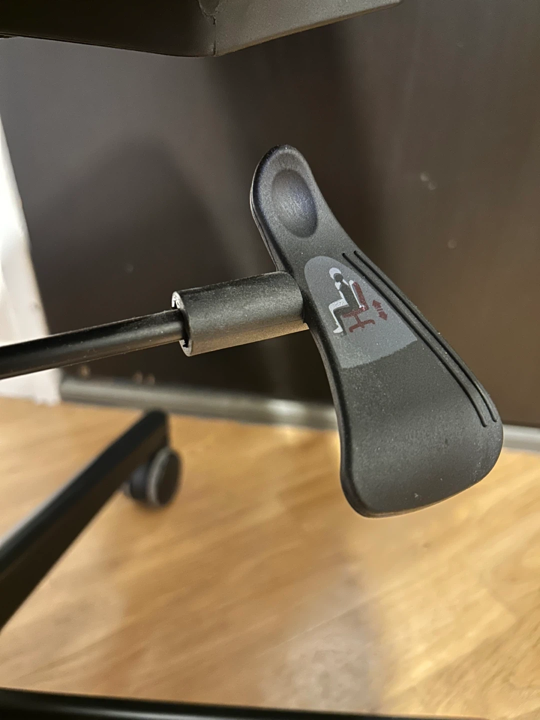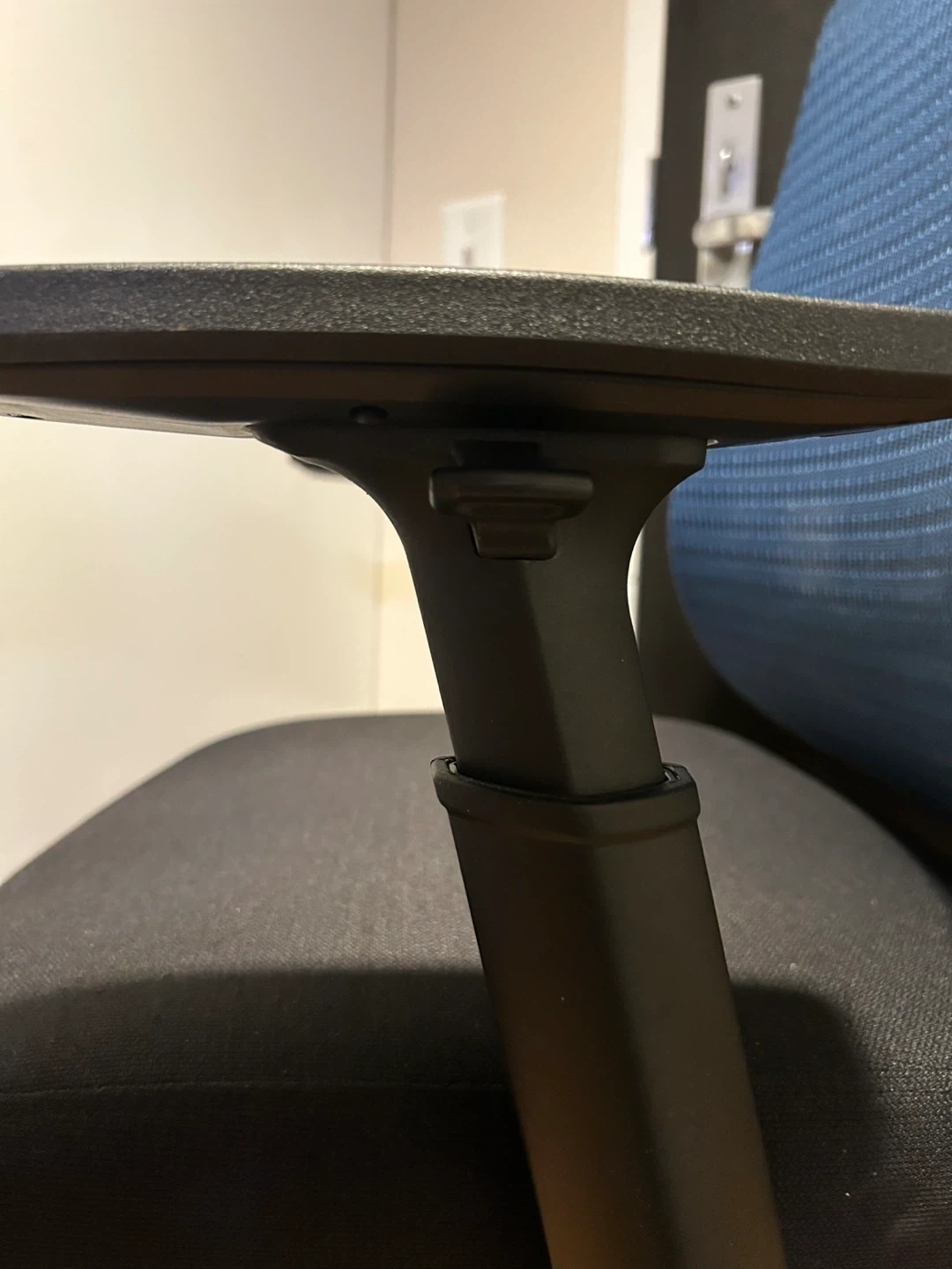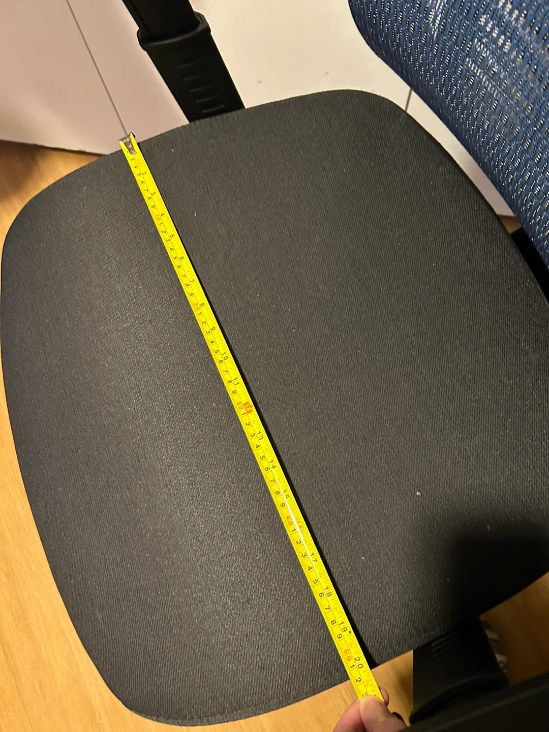 This is an ergonomic office chair with a breathable blue mesh back and a padded black seat. It features adjustable armrests and levers for height and back rest adjustments. It has a large seat cushion! In excellent condition.