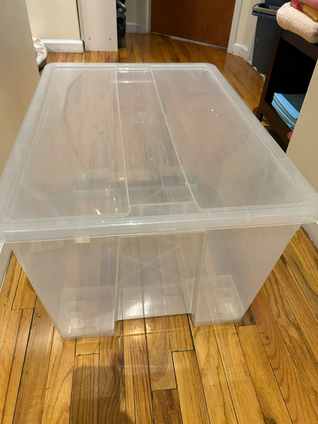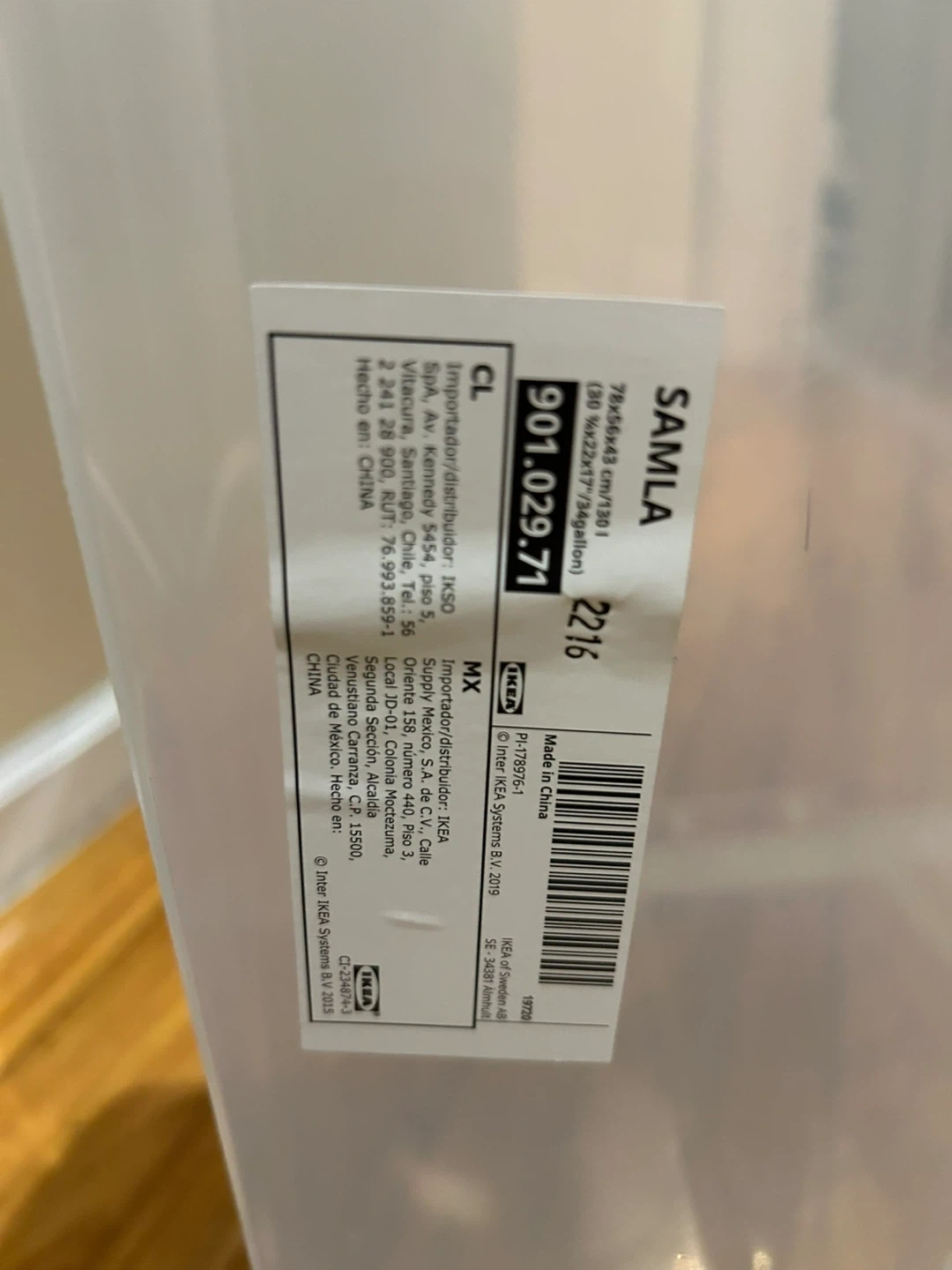 This is an IKEA SAMLA storage box. It measures 78x56x43 cm (30x22x17 inches). Made of plastic. Great for organizing household items!