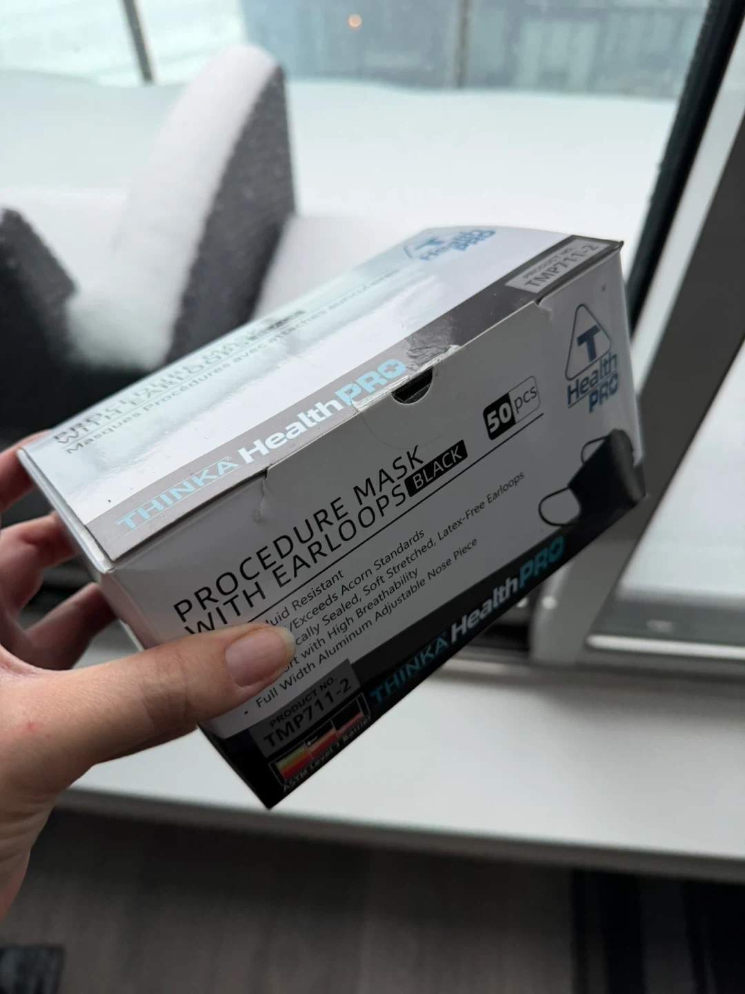 THiNKA Health PRO procedure masks in black. They exceed ASTM Levels Acorn standards and are fluid resistant. Each mask is individually sealed and latex-free. Full width, adjustable aluminum nose piece for better breathability