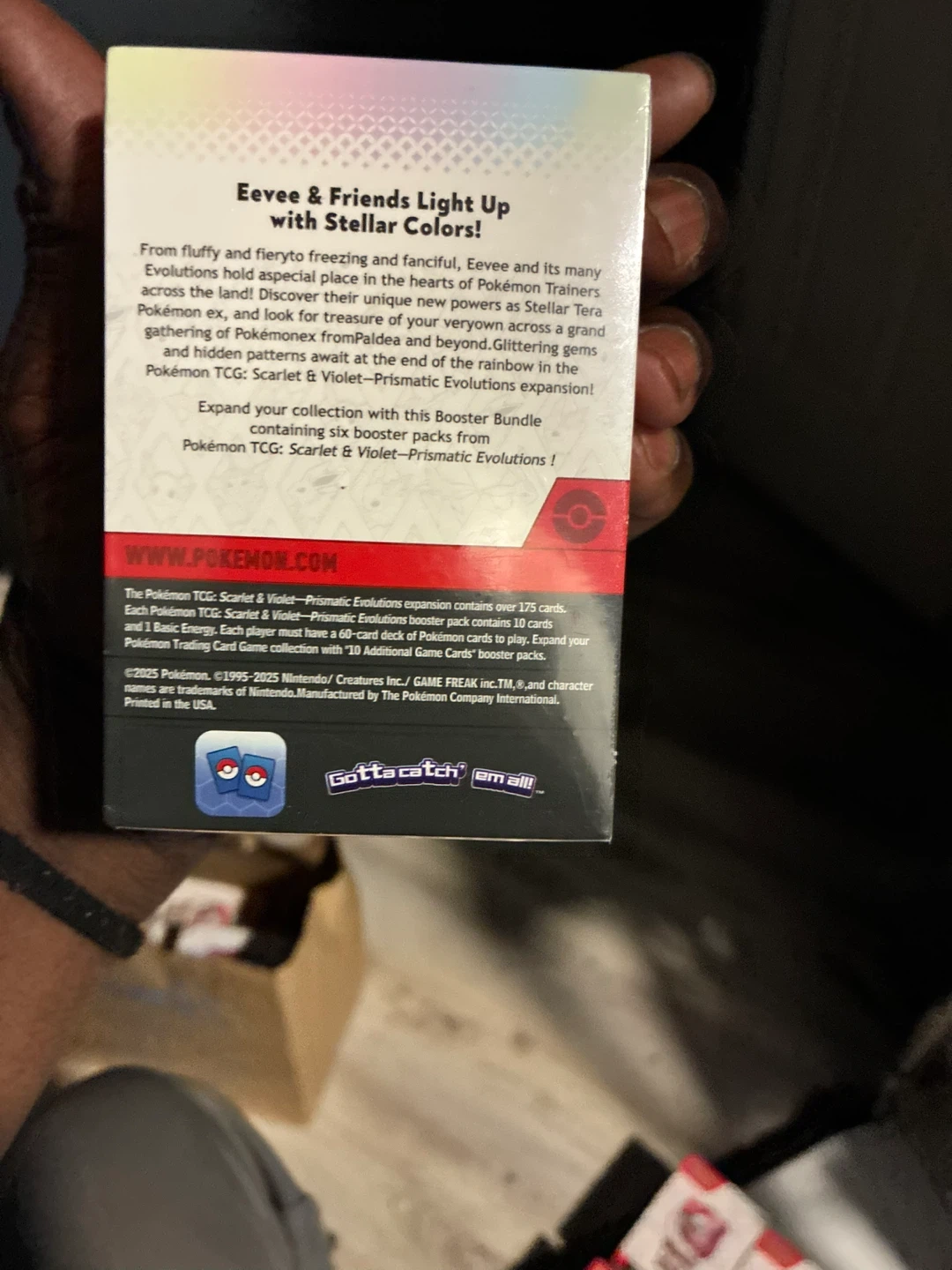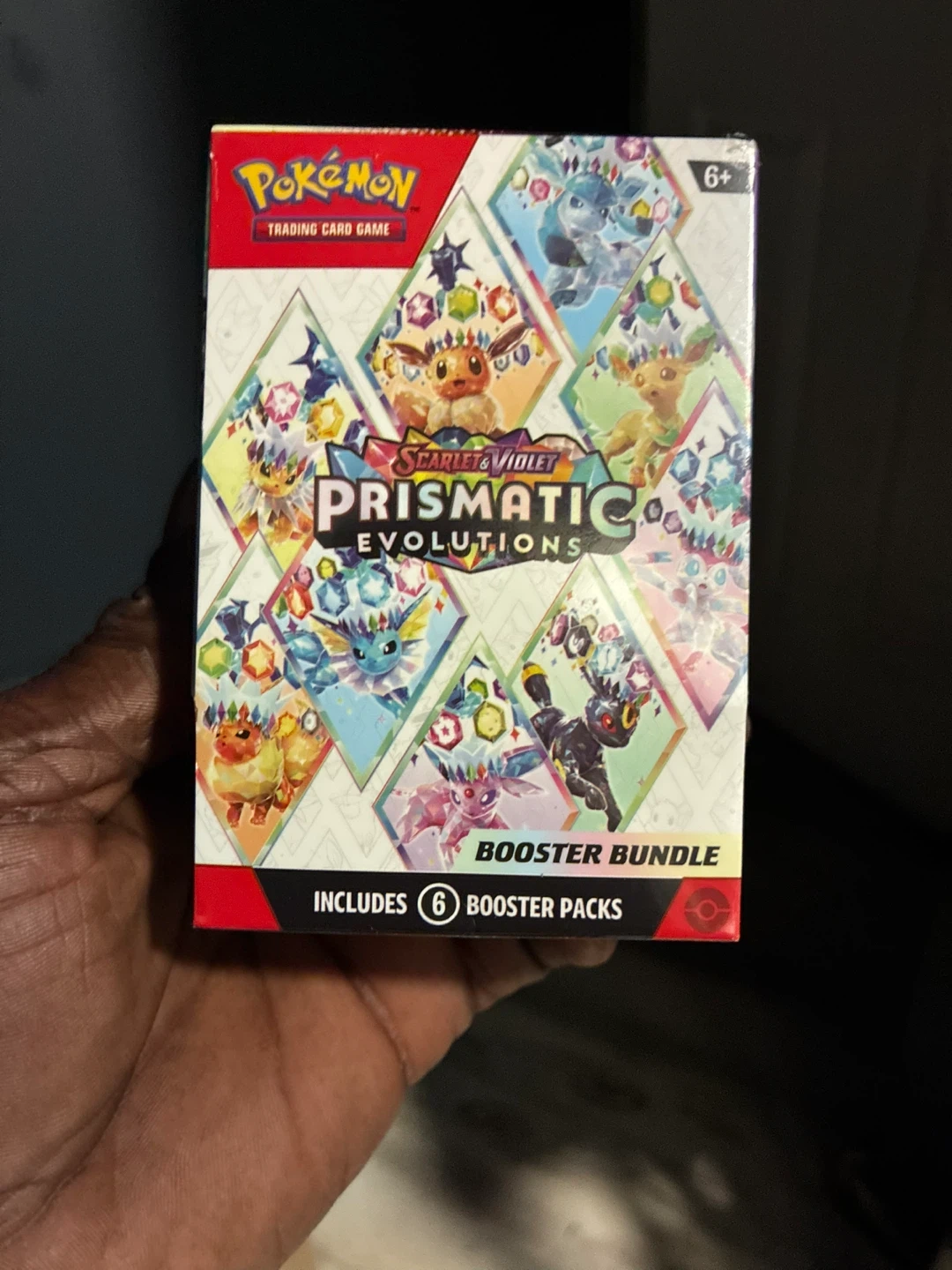 Pokemon TCG: Scarlet & Violet—Prismatic Evolutions booster bundle. It contains six booster packs. Each booster pack includes 10 cards and 1 Basic Energy.