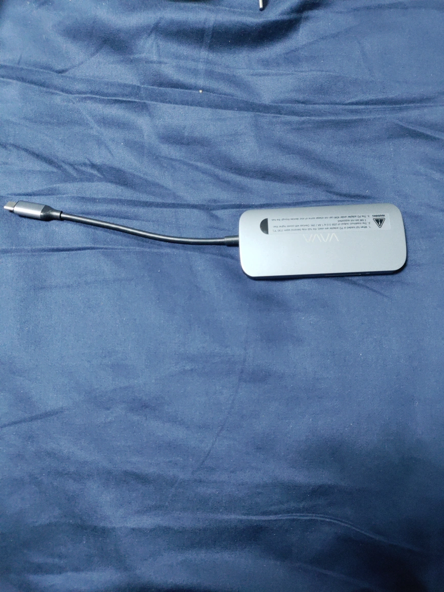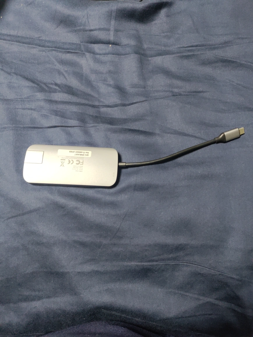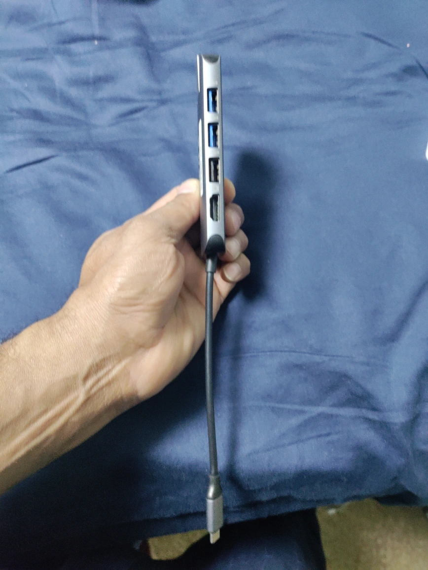 Silver USB-C hub. Multiple ports. Includes USB-A, SD card reader, and Micro SD card reader. Compact design. Good for travel.