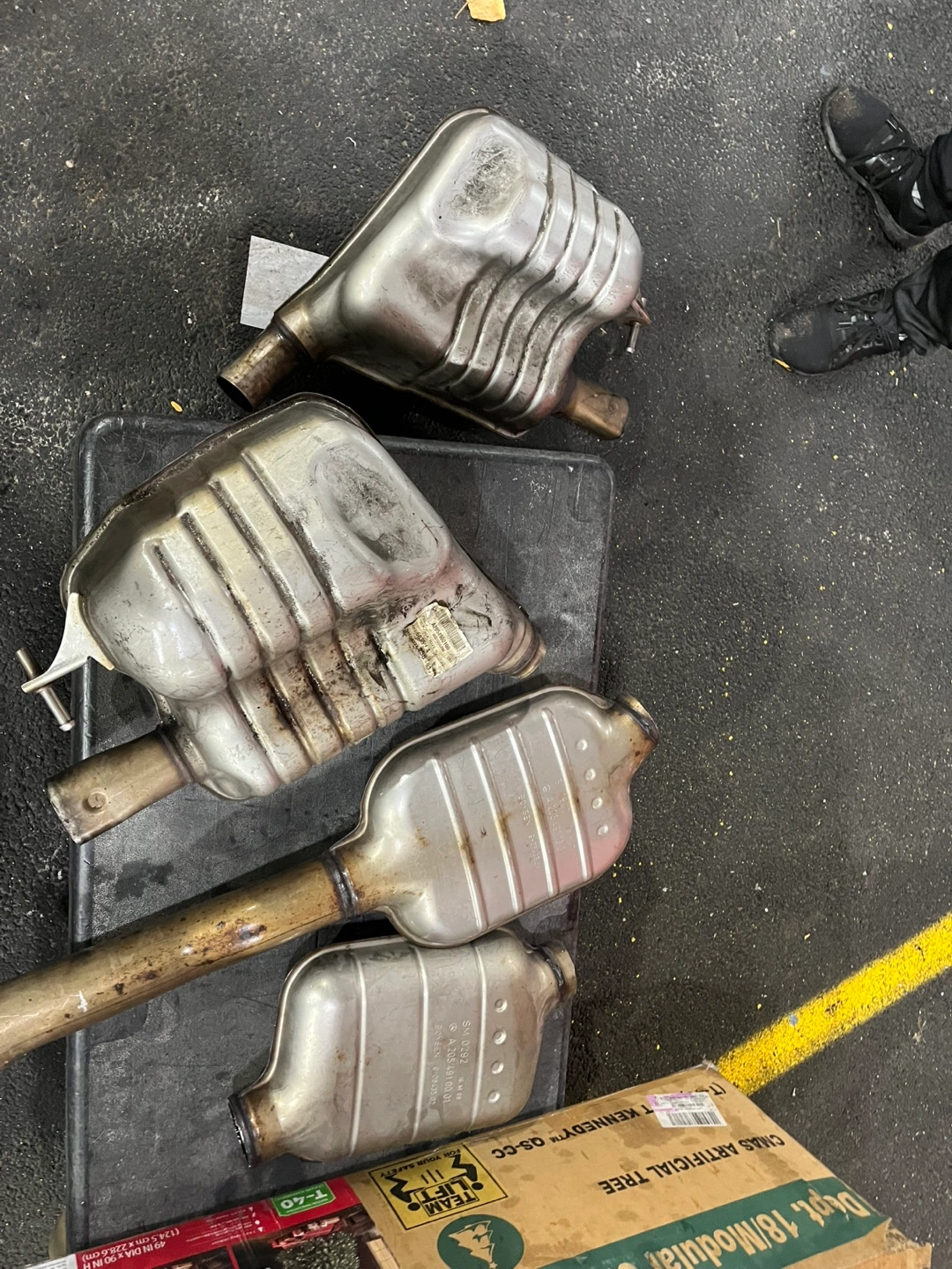 Set of used car exhaust mufflers. Various sizes. All in good condition. No dents, cracks, or holes. Perfect for a project car or to replace your old mufflers. For Mercedes Benz