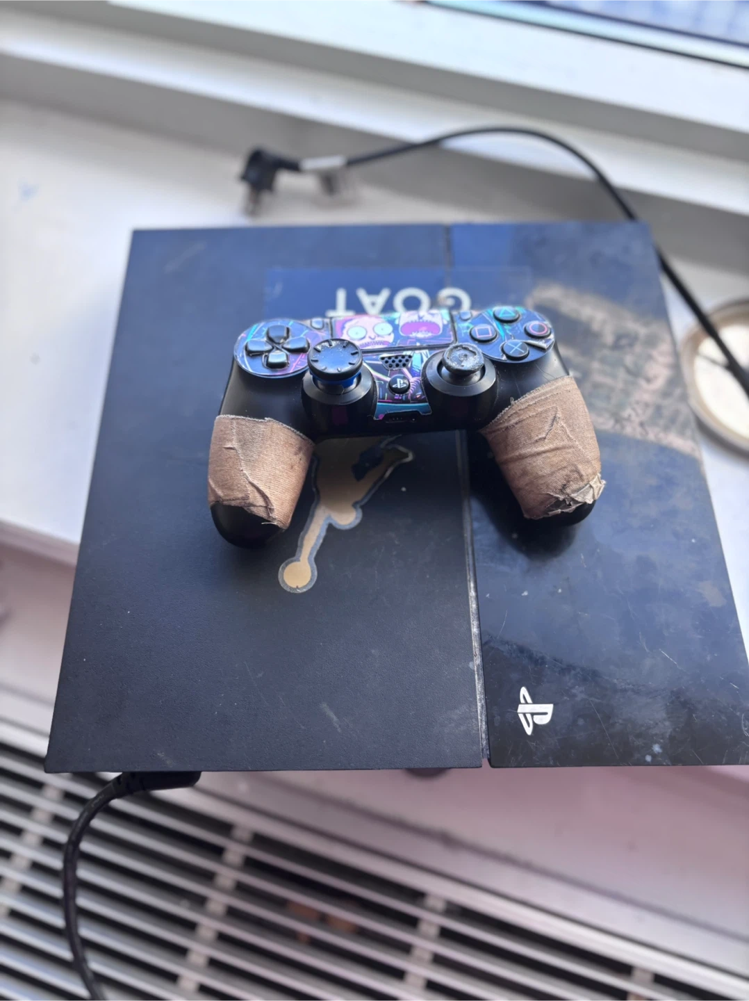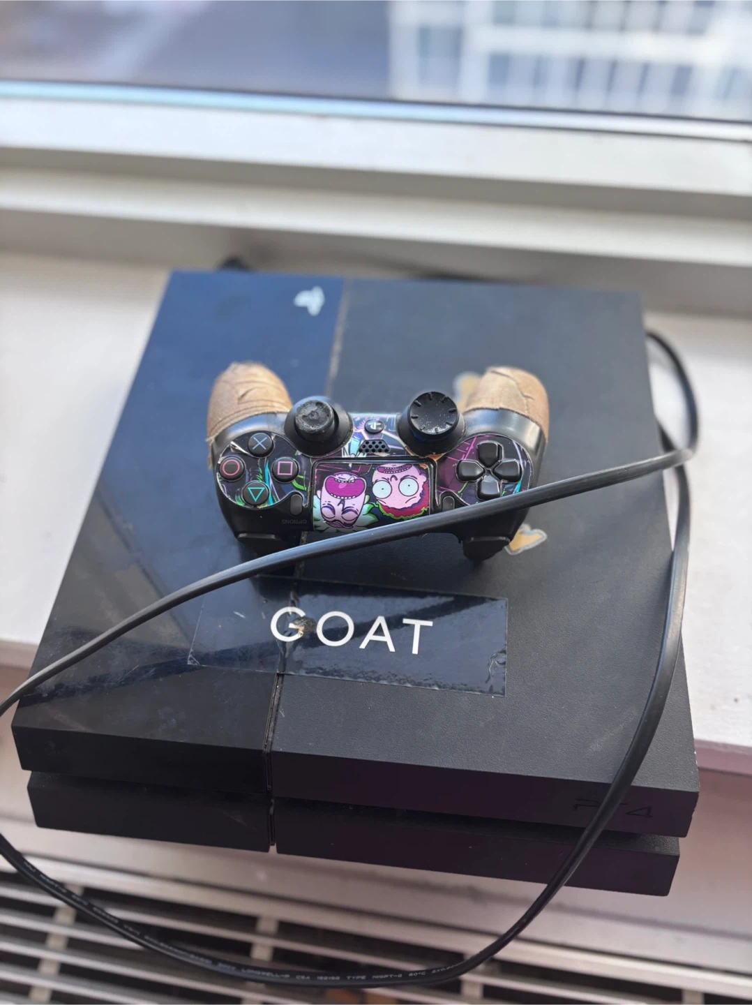 60Selling a used PlayStation 4 console. It has some visible wear , including a sticker on the top and tape on the controller. Please see the photos for details!
