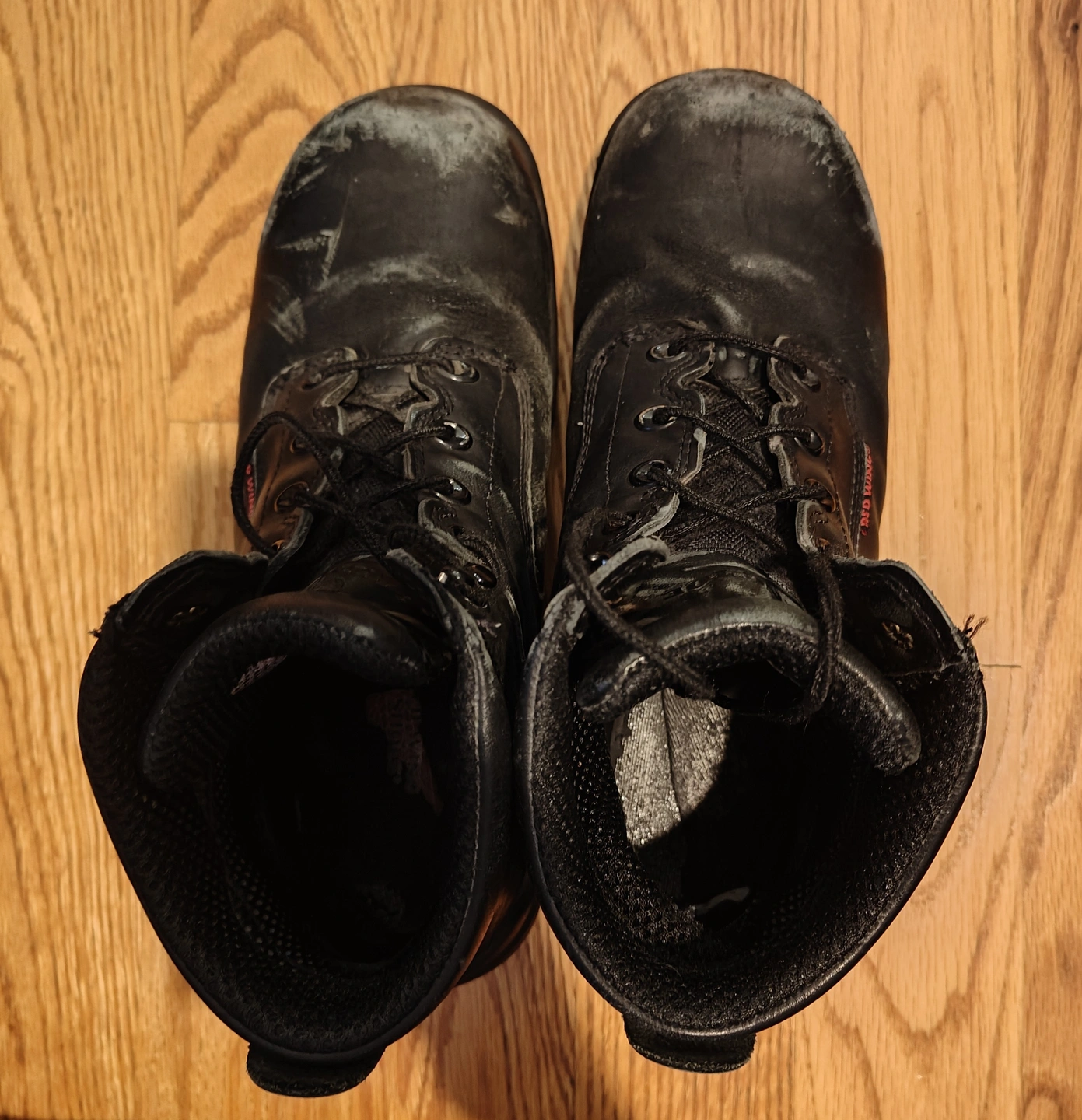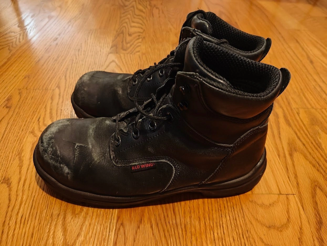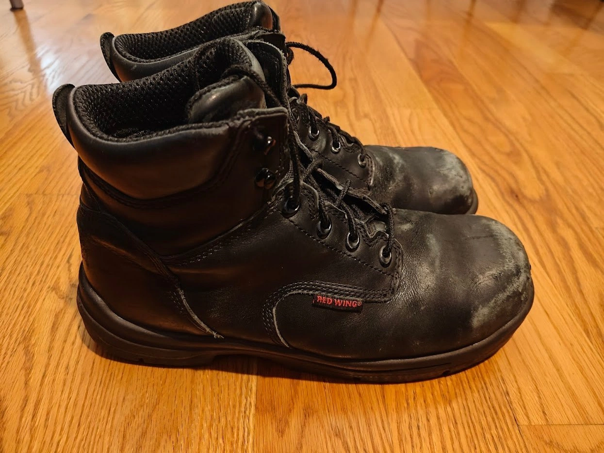 This is a pair of used high-quality composite-toe work boots with much cosmetic wear (see the photos); however, they are in good functional condition, very comfortable, lightweight, and waterproof. MEN'S SIZE US 10.5 UK 9.5 EUR 43.5 This safety-toe boot is an excellent combination of lightweight construction and a durable work boot. This boot is made with full-grain leather and has a non-metallic composite toe that meets or exceeds the ASTM safety standards. RW2234 Features: Full grain, water-resistant black Yukon leather Nylon-covered, polyurethane footbed Non-metallic shank Direct attach (sole is cemented to the boot, and molded) King toe (wider toe-box) Safety Rating: ASTM F2413-11, M, I/75, C/75, EH (Electrical Hazard-rated) The TPU-PU Galaxy sole is rated "Better" for slip resistance, "Best" for use with chemicals, oil/gas, "Best" against abrasions, good for handling heat, and is non-marking