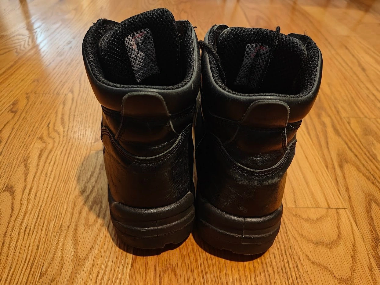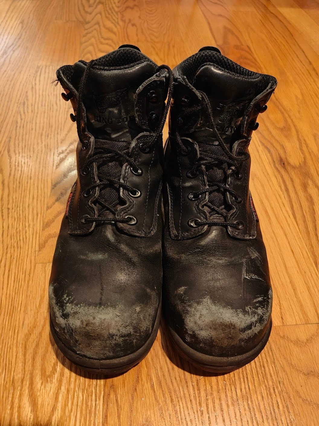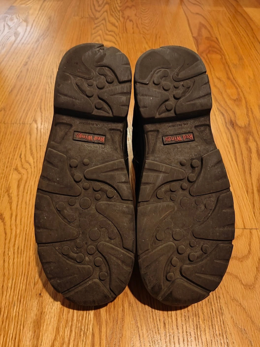 This is a pair of used high-quality composite-toe work boots with much cosmetic wear (see the photos); however, they are in good functional condition, very comfortable, lightweight, and waterproof. MEN'S SIZE US 10.5 UK 9.5 EUR 43.5 This safety-toe boot is an excellent combination of lightweight construction and a durable work boot. This boot is made with full-grain leather and has a non-metallic composite toe that meets or exceeds the ASTM safety standards. RW2234 Features: Full grain, water-resistant black Yukon leather Nylon-covered, polyurethane footbed Non-metallic shank Direct attach (sole is cemented to the boot, and molded) King toe (wider toe-box) Safety Rating: ASTM F2413-11, M, I/75, C/75, EH (Electrical Hazard-rated) The TPU-PU Galaxy sole is rated "Better" for slip resistance, "Best" for use with chemicals, oil/gas, "Best" against abrasions, good for handling heat, and is non-marking