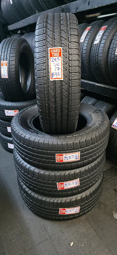 Selling a used tire with the following specifications: 245 70 17. The price is $90 each installation and balancing free we have full set
