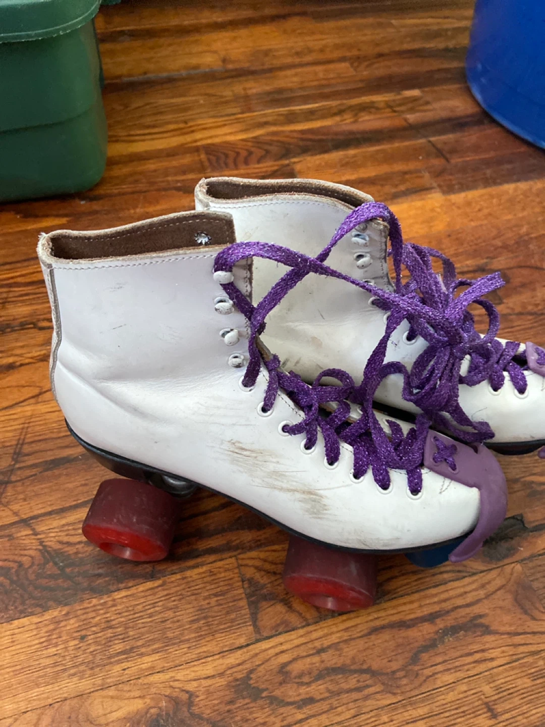 20Selling a pair of used white roller skates. They have purple laces and red wheels. Good for some fun skating!