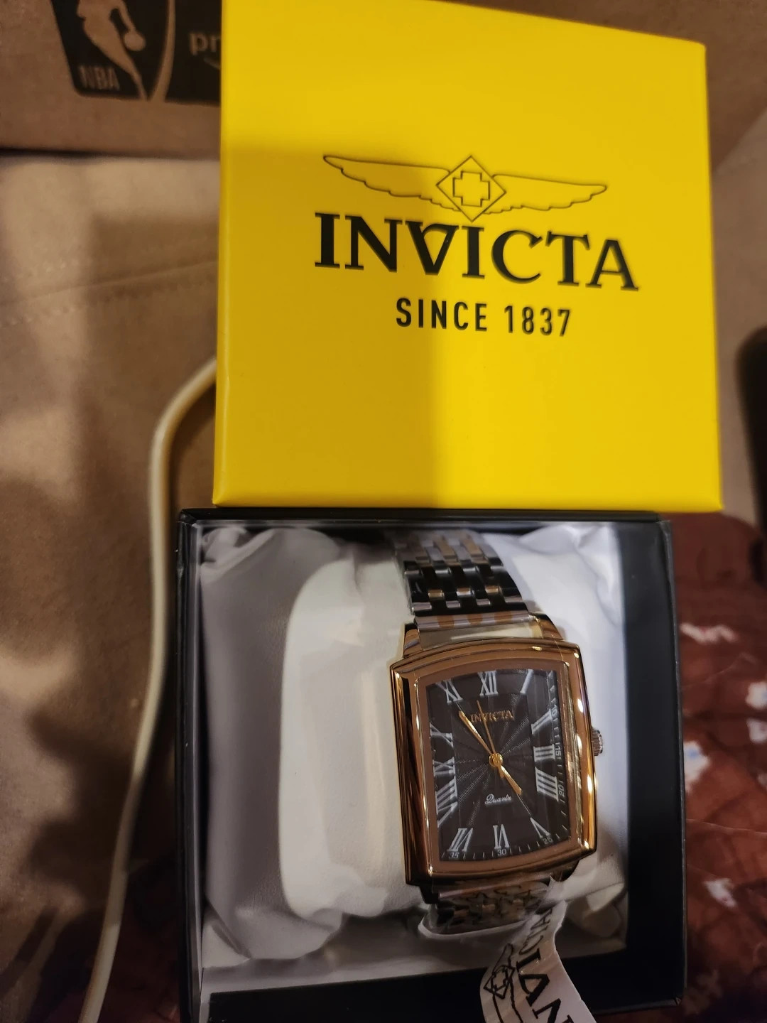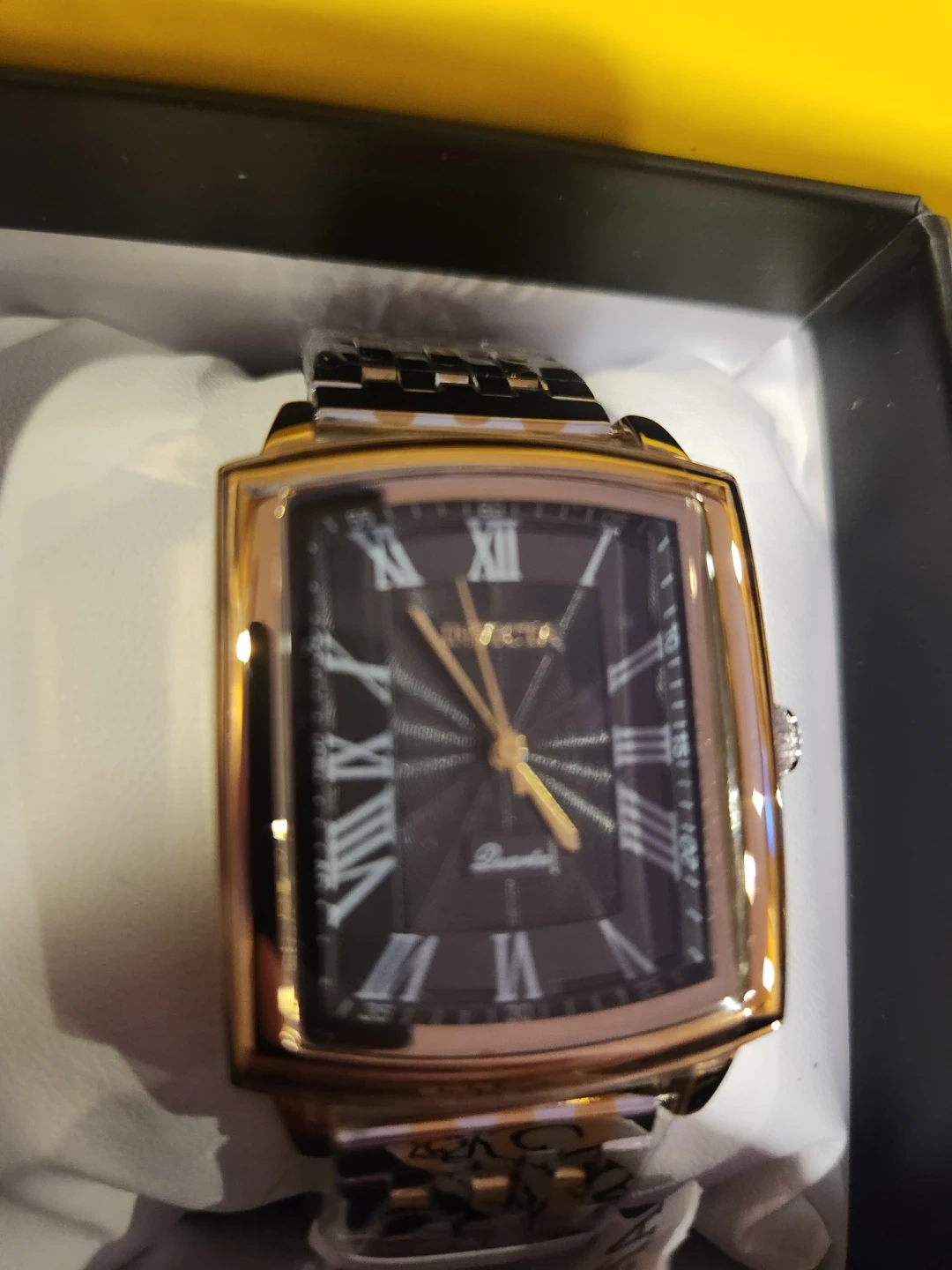 This Invicta watch features a stylish rectangular face with Roman numerals and a date display. It has a two-tone metal band and comes in its original box. Quartz movement ensures accurate timekeeping.