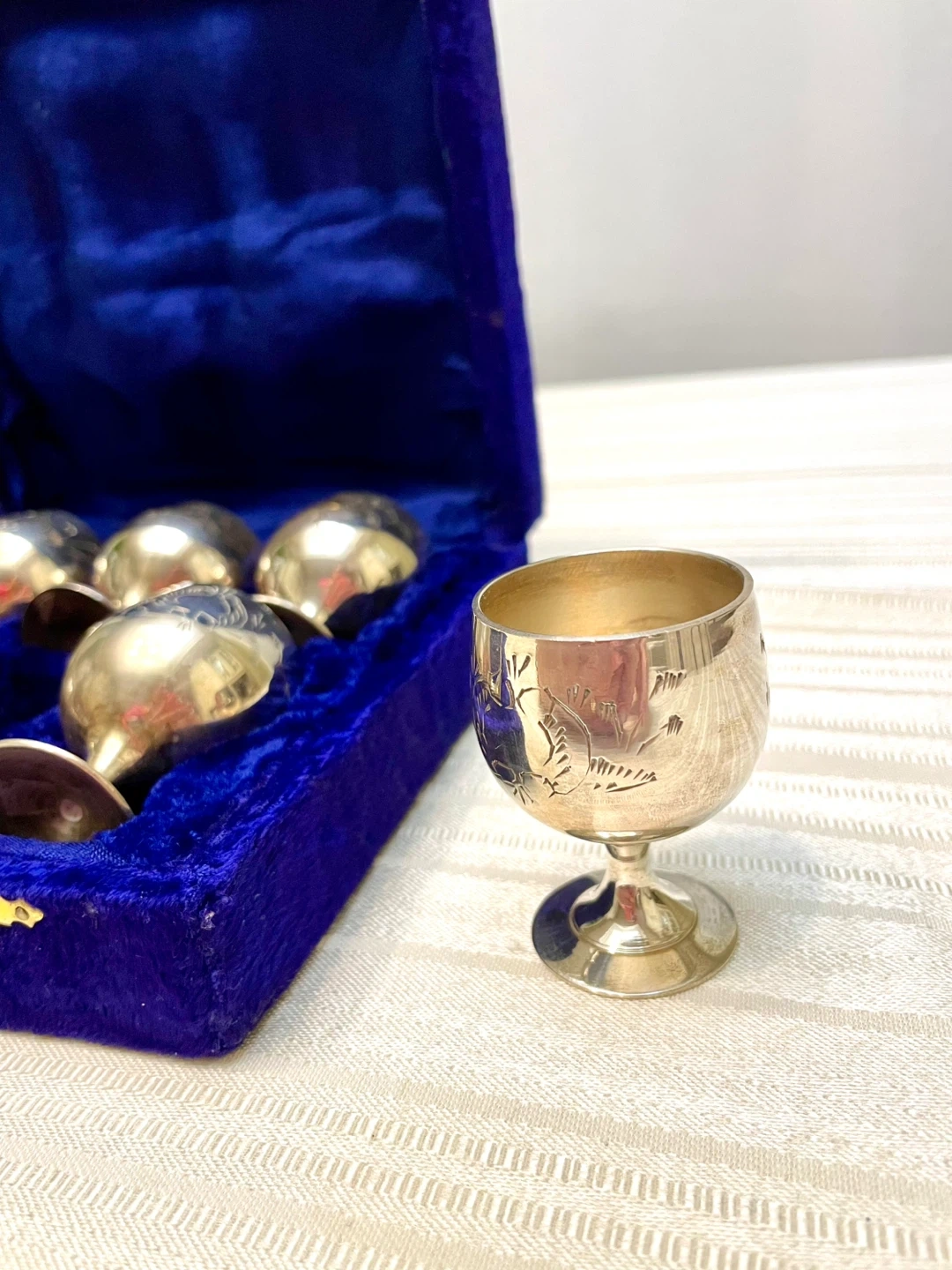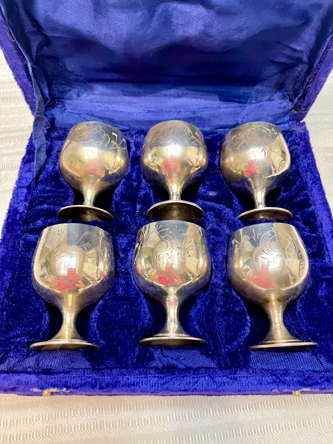 Stunning set of six silver plated etched cordial goblets in original Royal Blue Velvet Presentation Case.