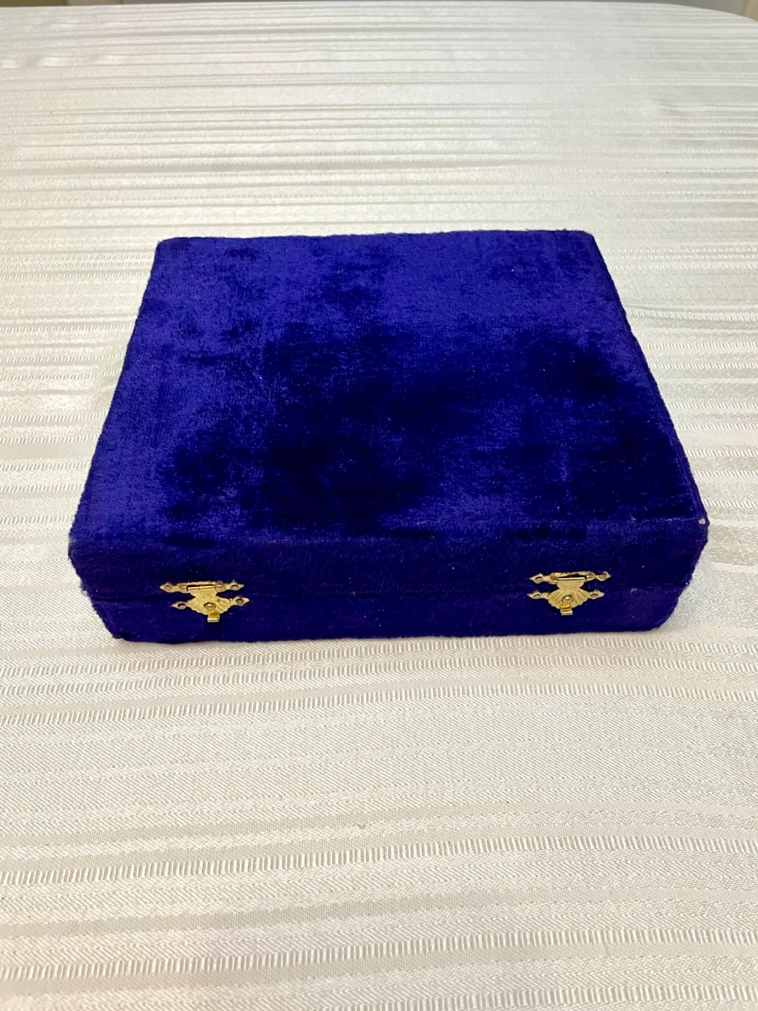 -Comes in its original solid royal blue velvet presentation box with gold-colored clasps
