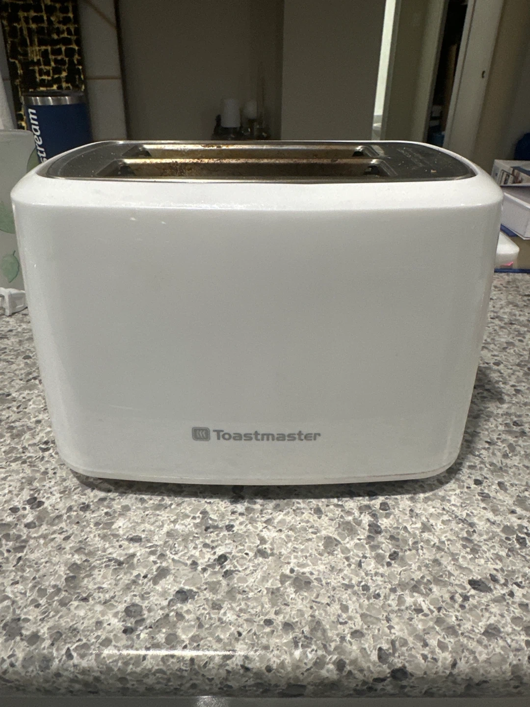 This is a white Toastmaster 2-slice toaster. It has a white exterior with a chrome trim around the slots. The toaster features a lever to lower the bread and a dial for browning settings. Perfect for making toast at home!