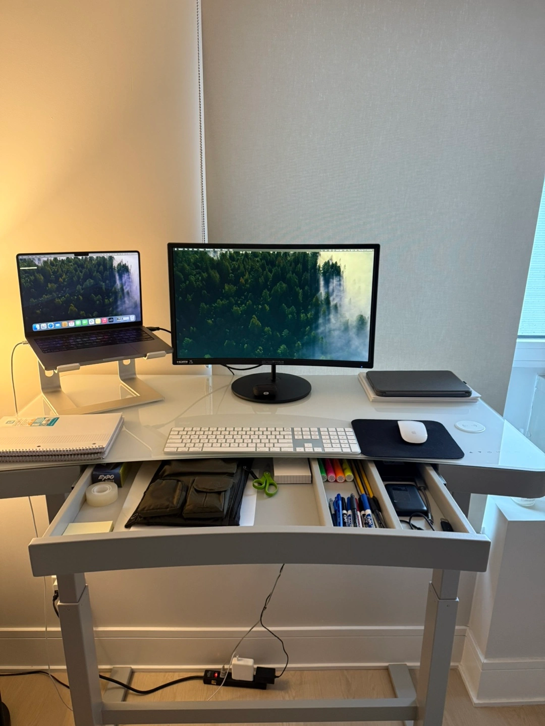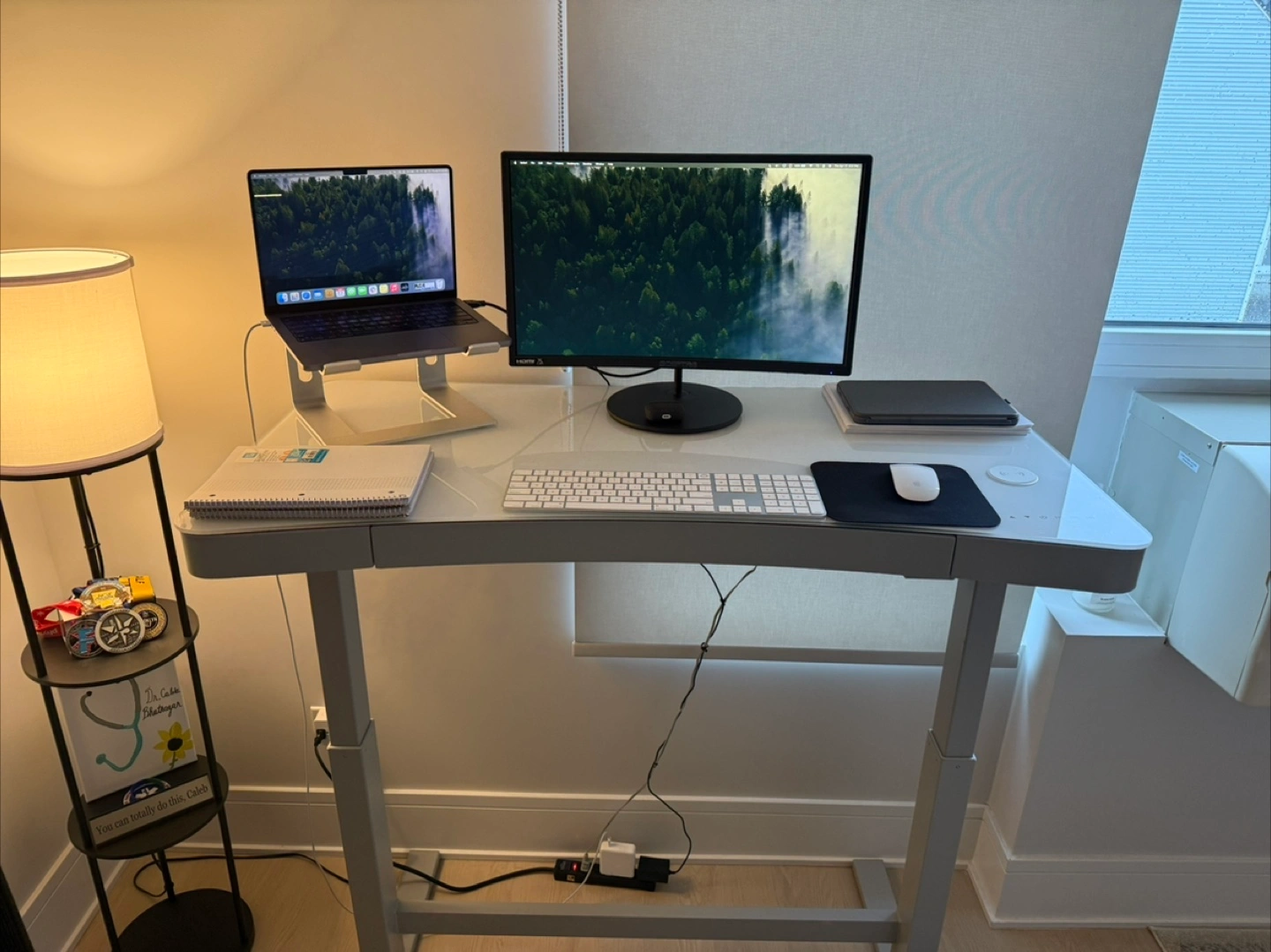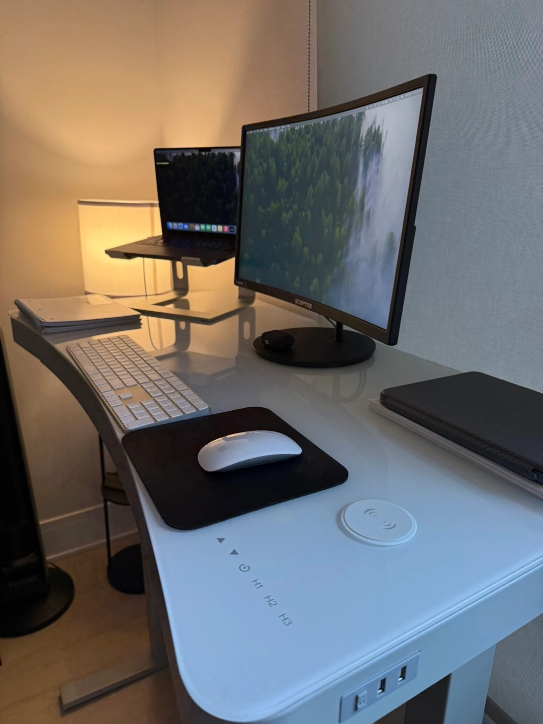 A contemporary, electric standing desk. Features a smooth, white surface. Height adjustment is possible. It is great for someone who spends a lot of time sitting and needs a change of pace.