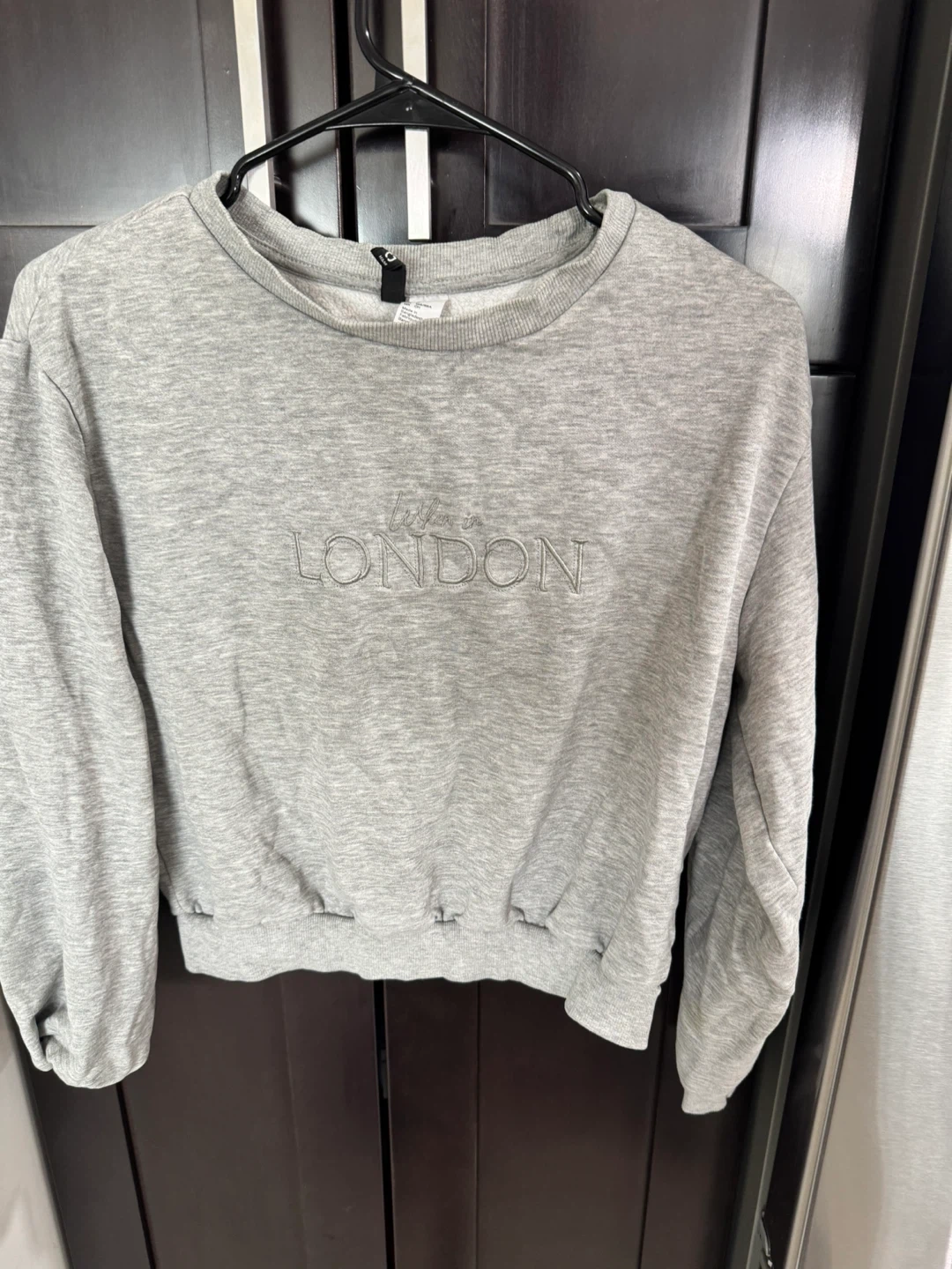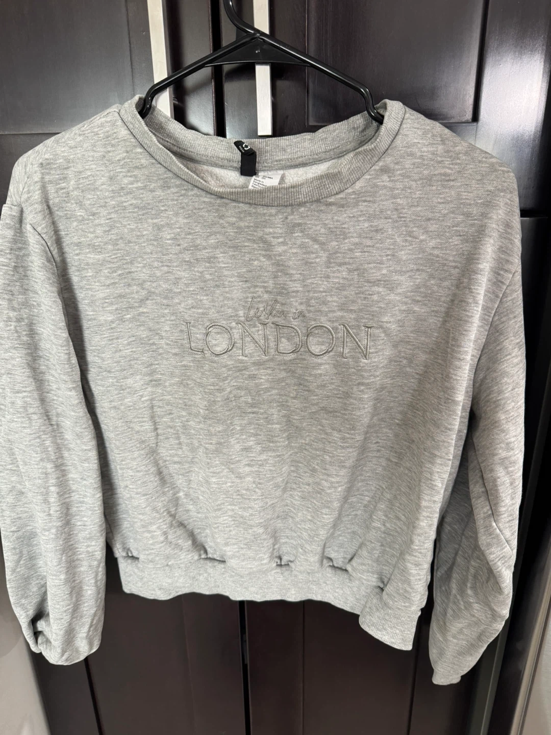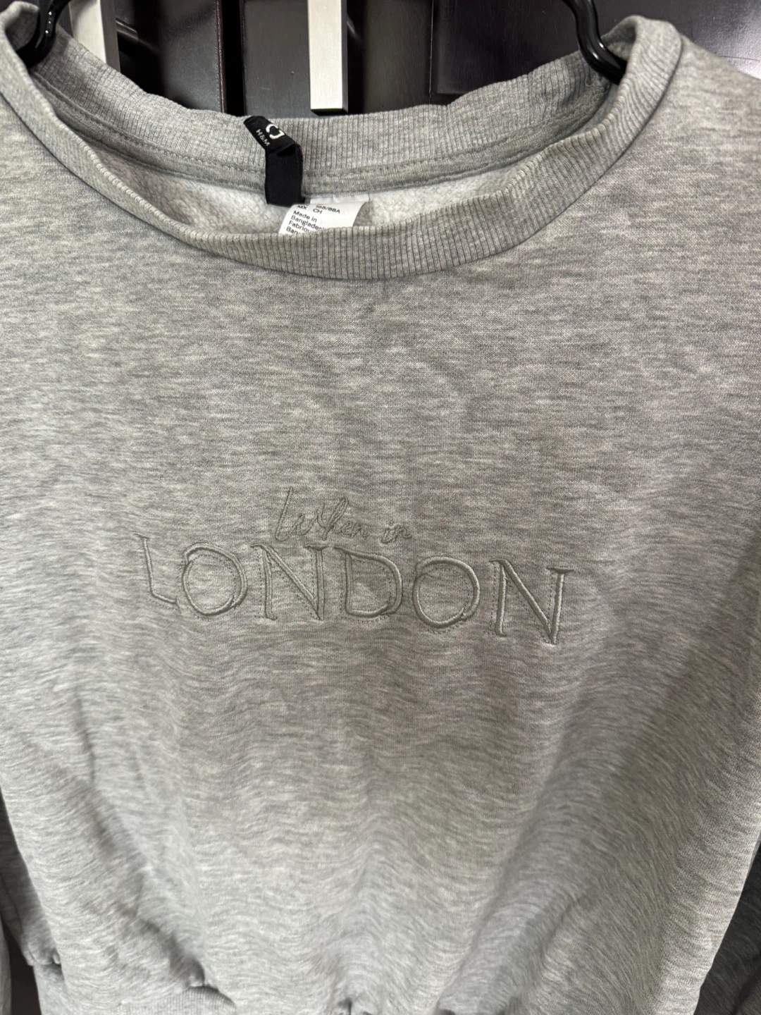 Grey sweatshirt with "Living in London" embroidered text. Size US S. Made in Bangladesh.