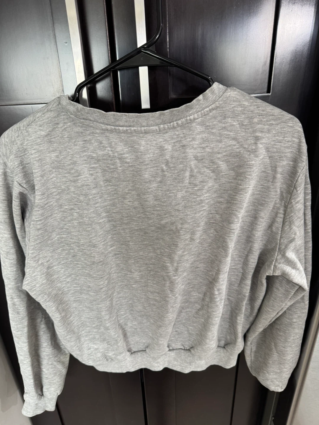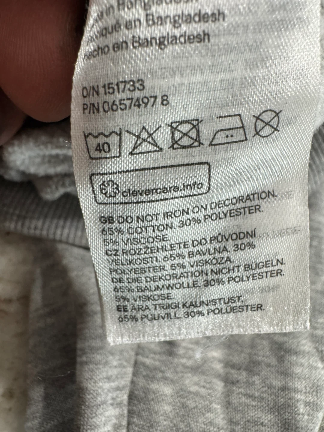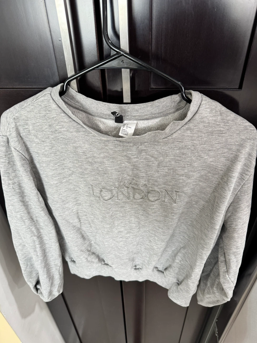 Grey sweatshirt with "Living in London" embroidered text. Size US S. Made in Bangladesh.