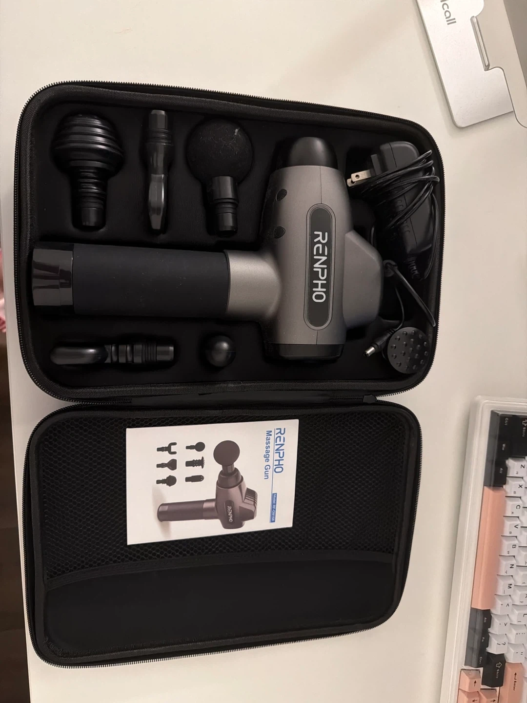 RENPHO massage gun in a carrying case. It comes with multiple attachments and a charger. Includes instruction manual.