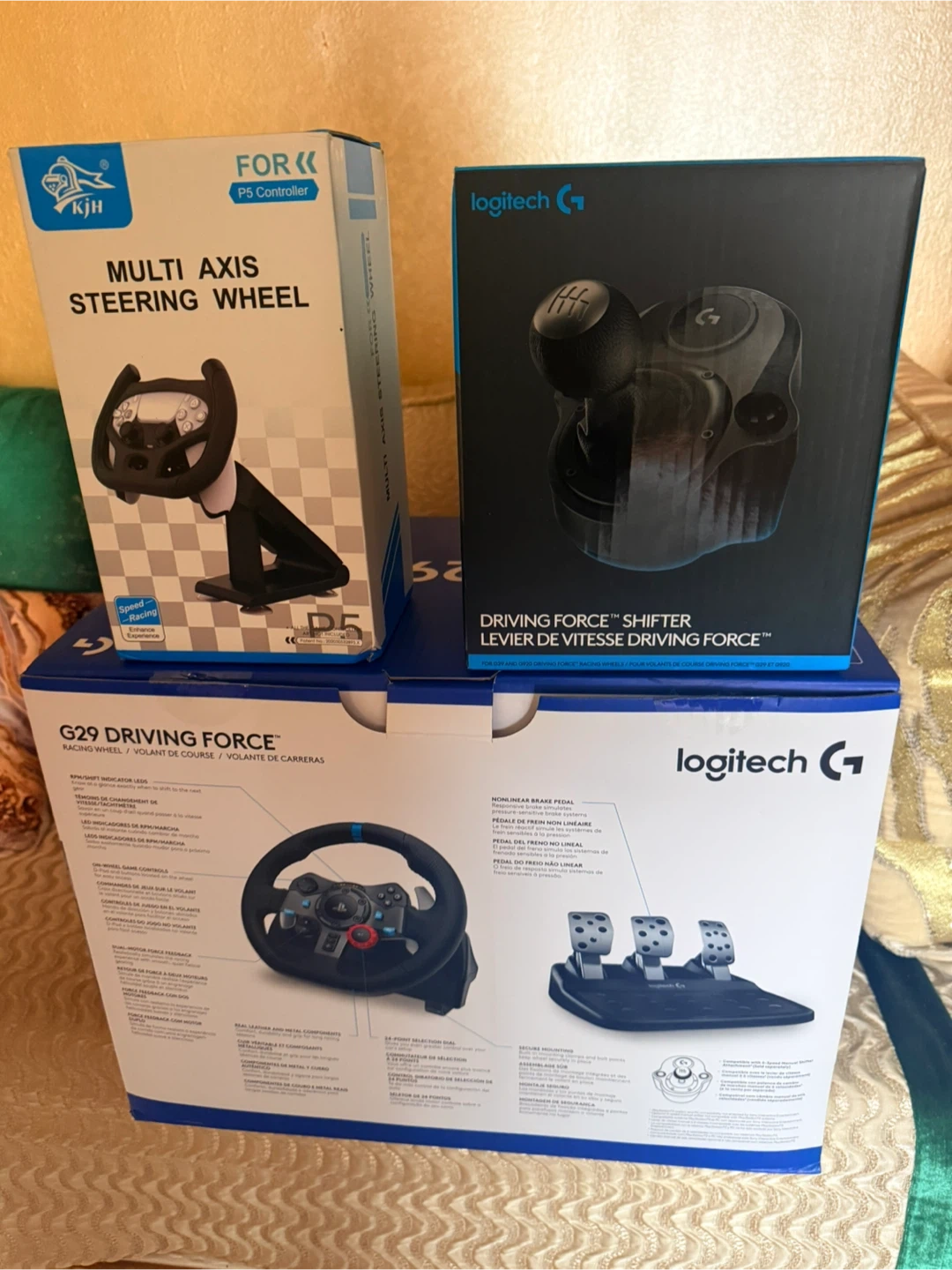 This bundle includes the Logitech G29 Driving Force racing wheel and the Driving Force shifter. The racing wheel features real leather and metal components with a 24-point selection dial and LED RPM/shift indicators. It's compatible with PS5 controllers and offers pressure-sensitive brake systems.