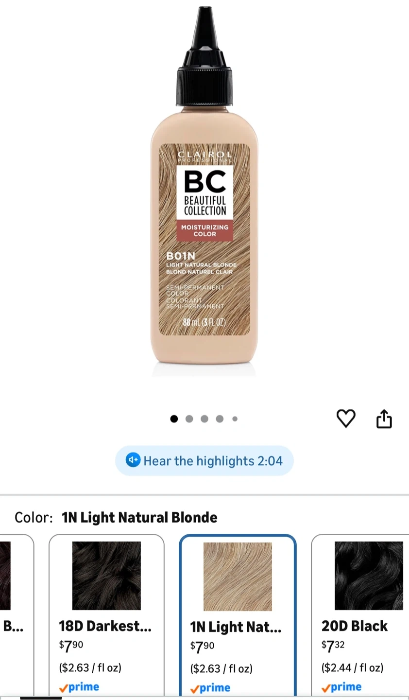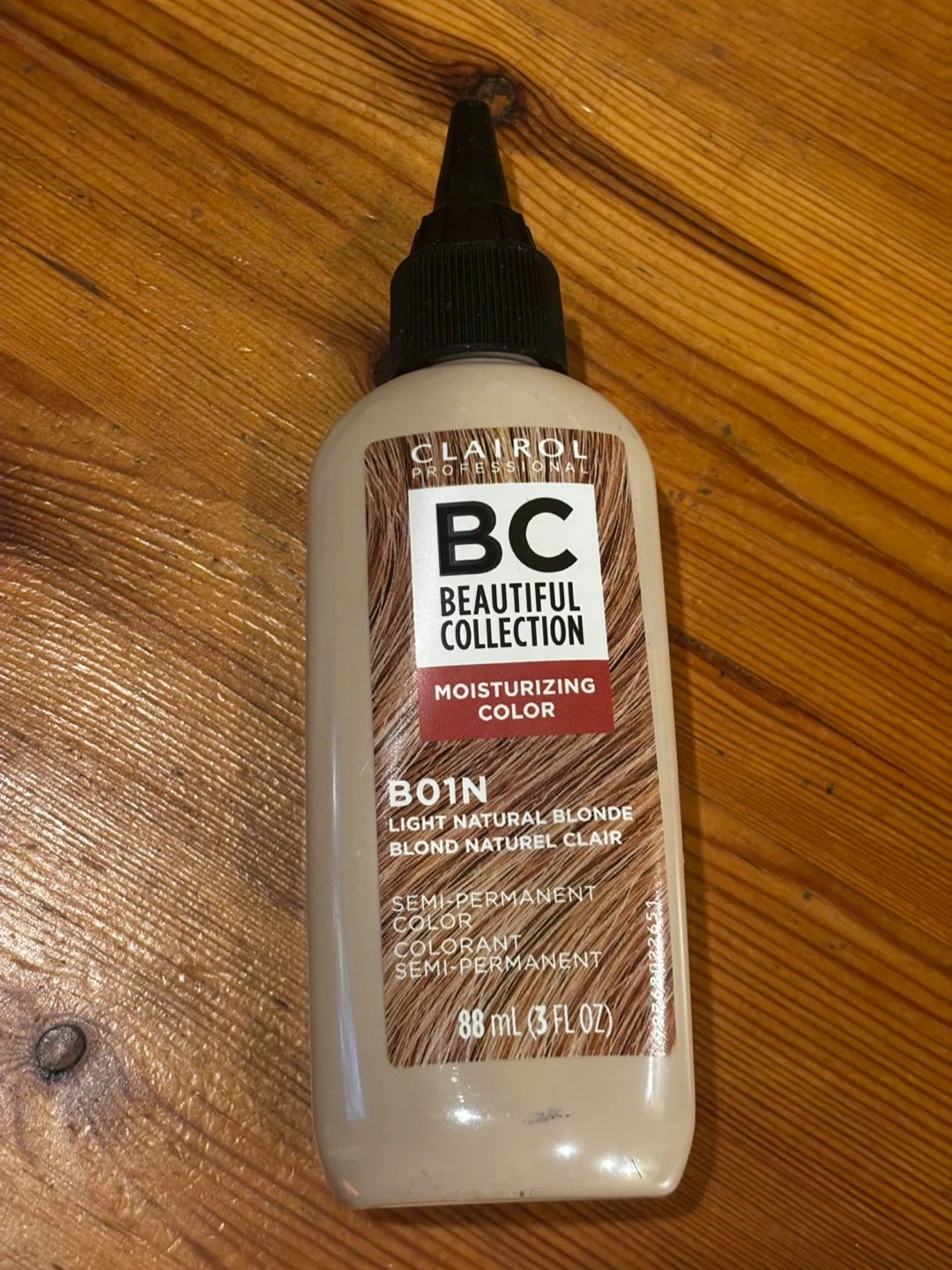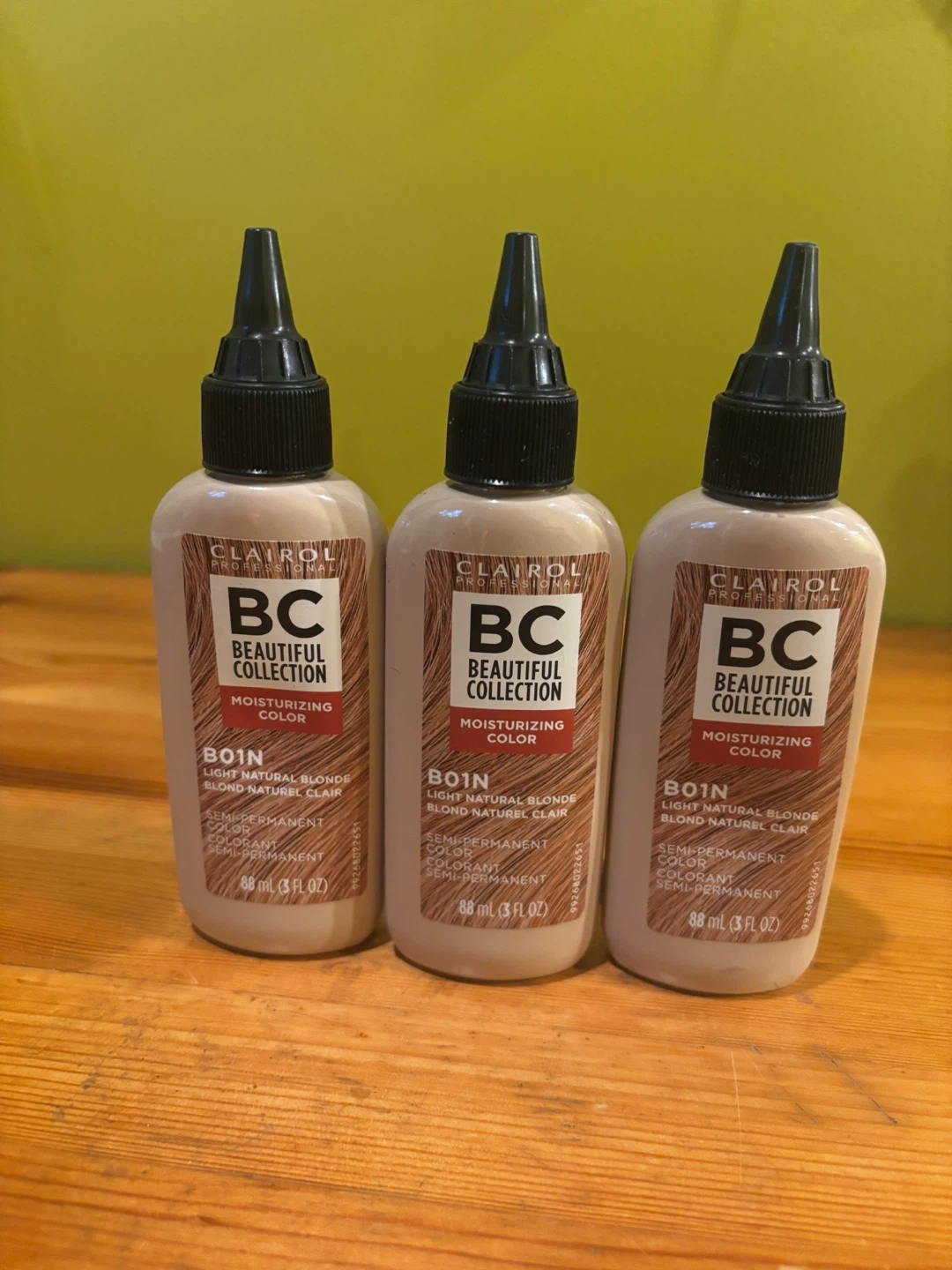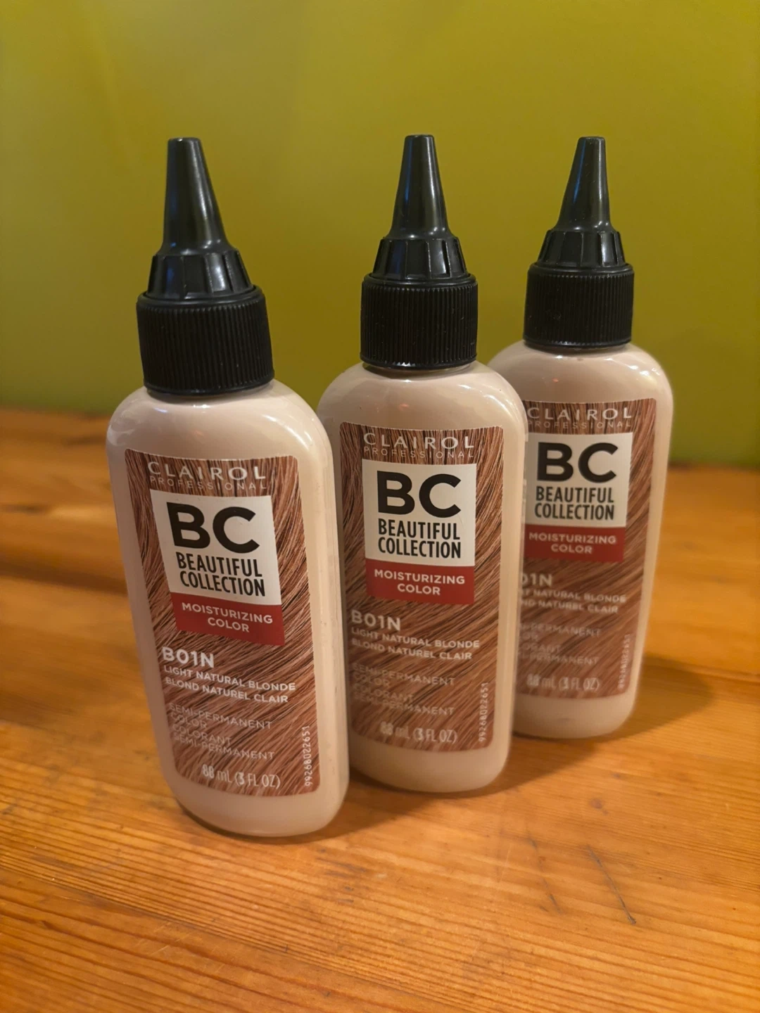 Clairol Beautiful Collection Moisturizing Color in shade 1N Light Natural Blonde. This semi-permanent hair color is ammonia, peroxide, and animal-derived ingredient free. Each bottle contains 88 ml (3 fl oz). 3 bottles.