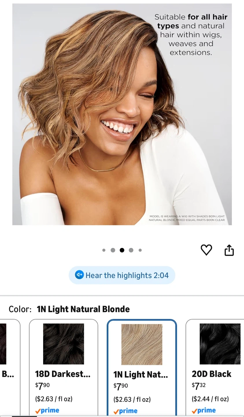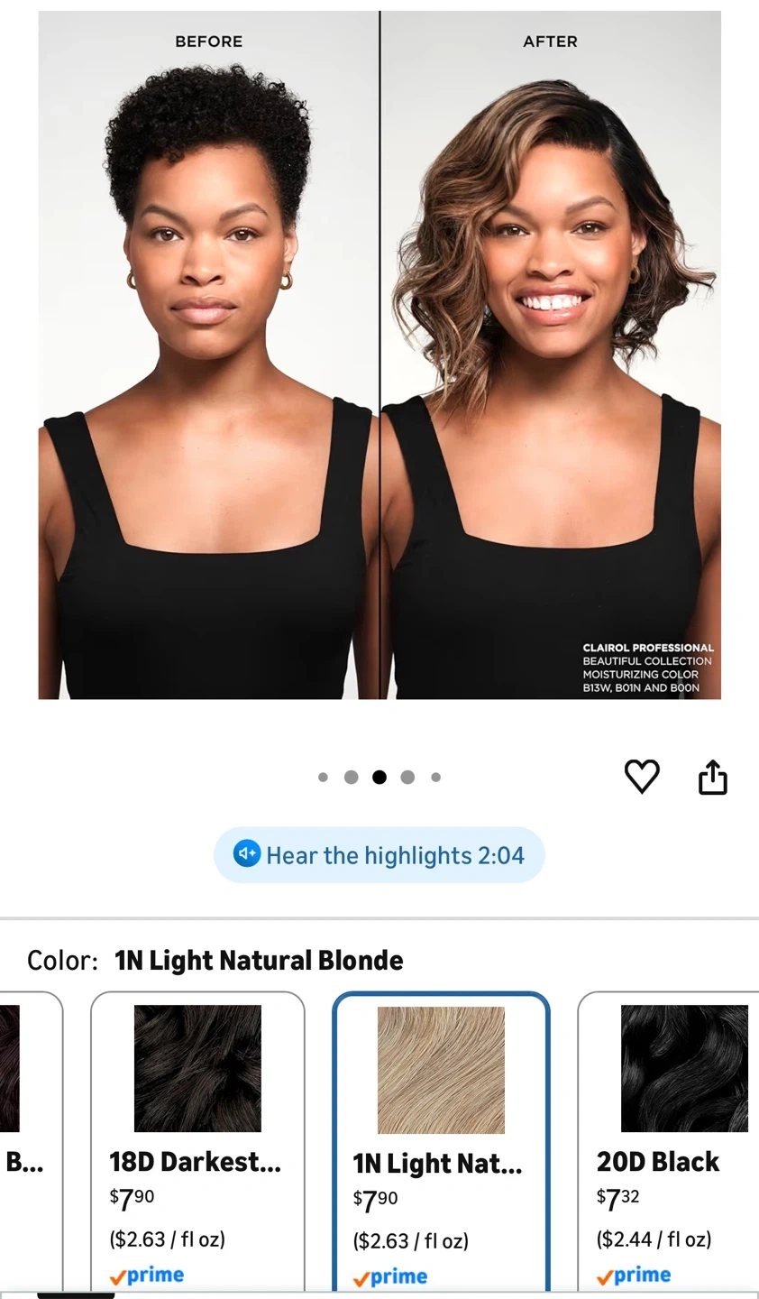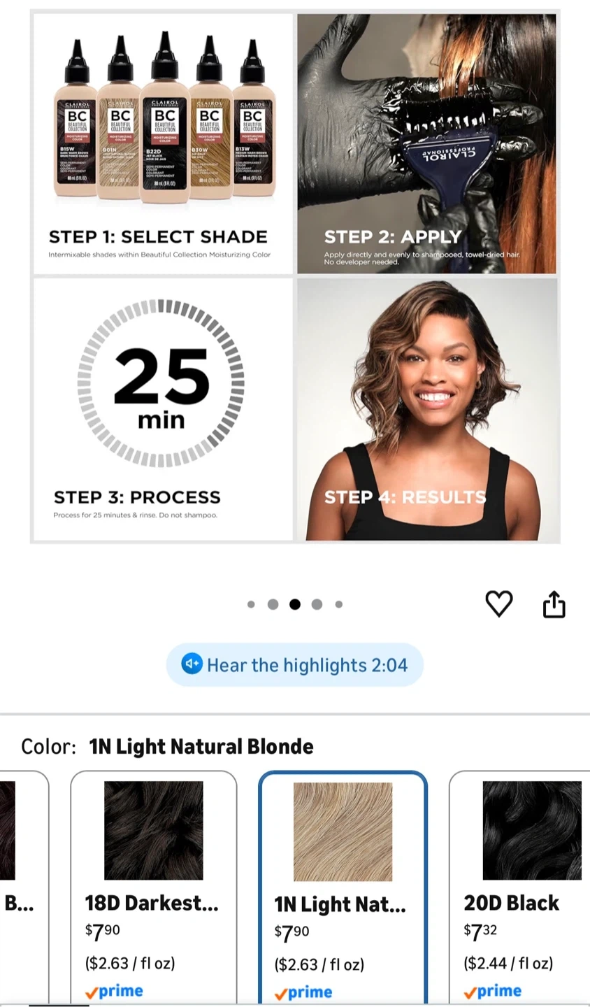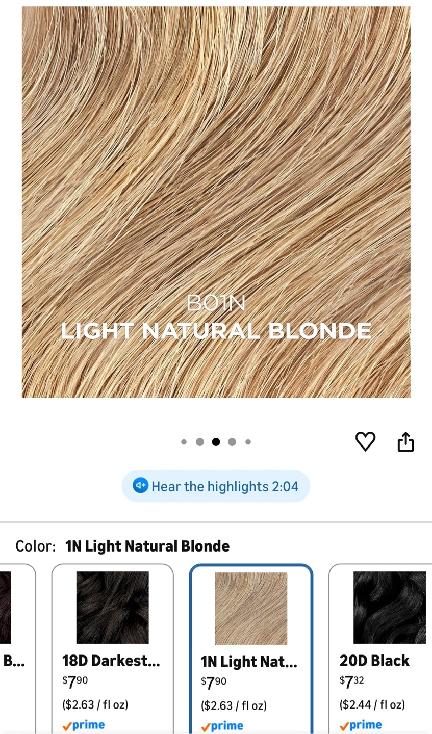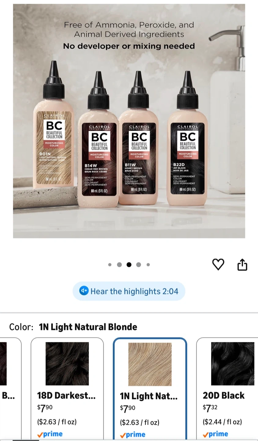 Clairol Beautiful Collection Moisturizing Color in shade 1N Light Natural Blonde. This semi-permanent hair color is ammonia, peroxide, and animal-derived ingredient free. Each bottle contains 88 ml (3 fl oz). 3 bottles.
