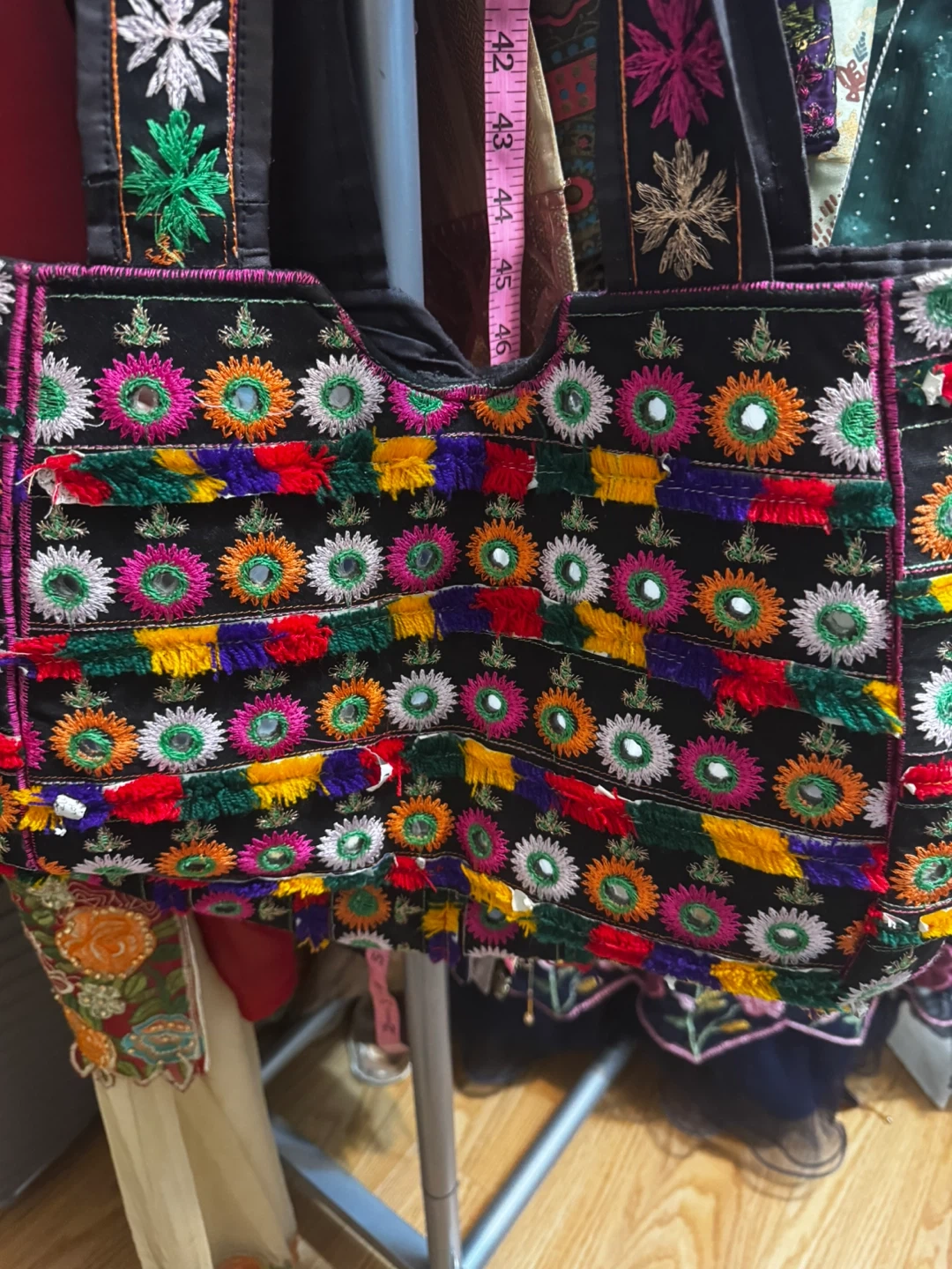 This black tote bag features vibrant, colourful embroidery with small mirror accents throughout. It has sturdy fabric handles. Its colourful, detailed design makes it a statement piece!