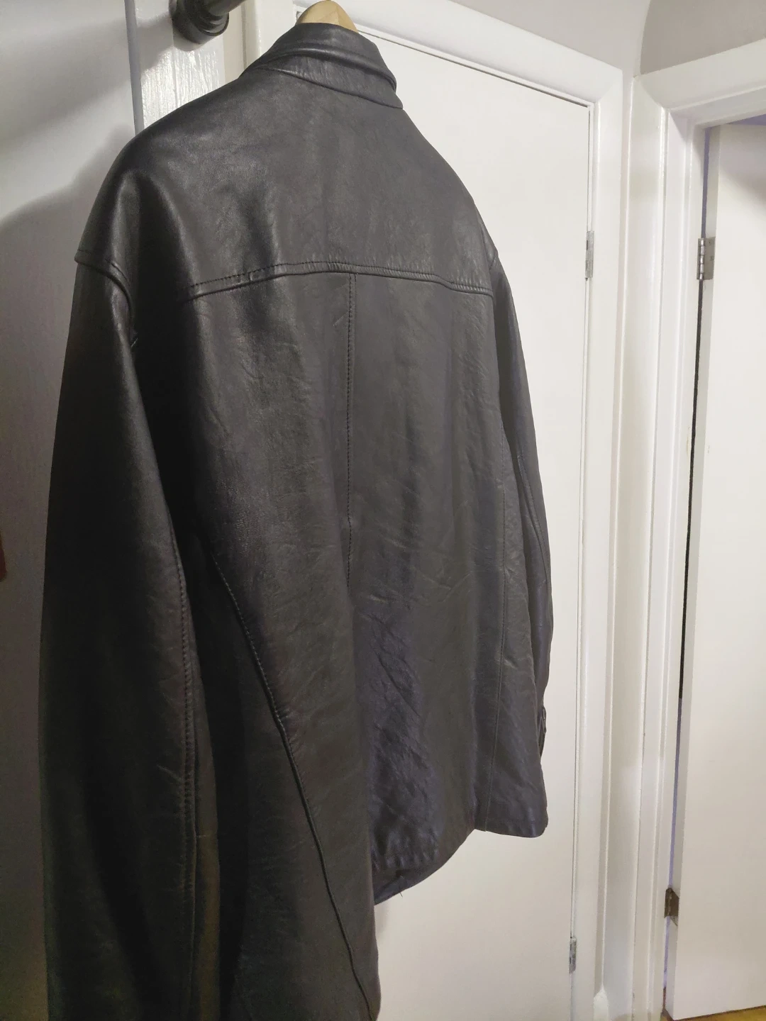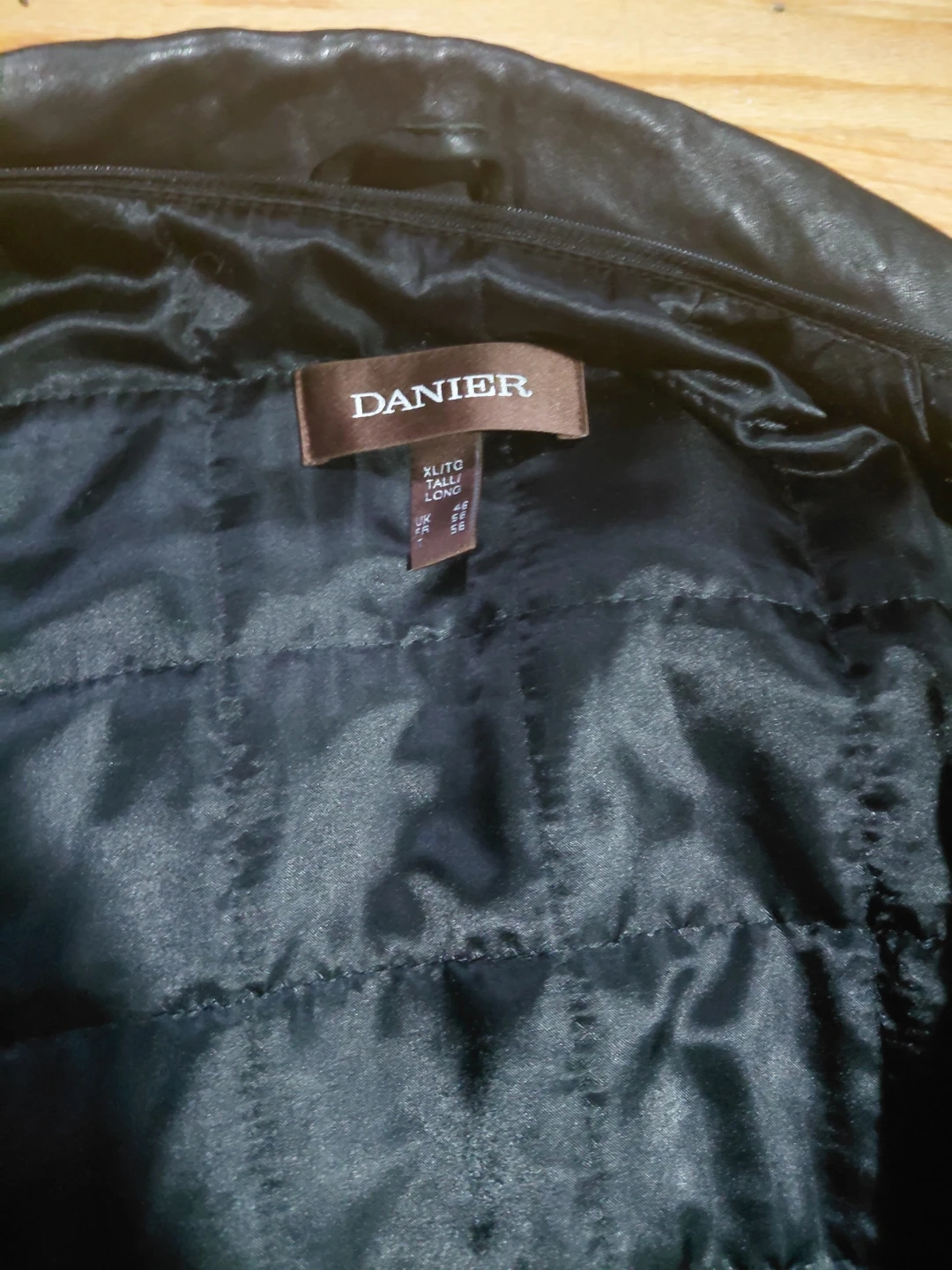 Selling a Danier black leather jacket in size XL/TG (Tall/Long). It's in good shape and is very comfortable