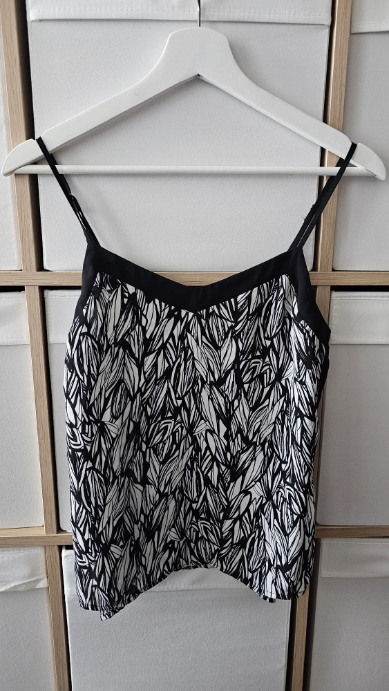 A stylish camisole top. Black and white pattern with spaghetti straps. A great item for layering under a sweater or blazer.