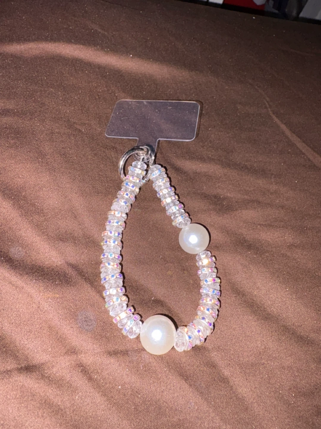 A sparkly beaded strap with two large faux pearls and a clear attachment tab. It attaches to your phone case or phone for easy carrying. Great for adding some flair to your device!