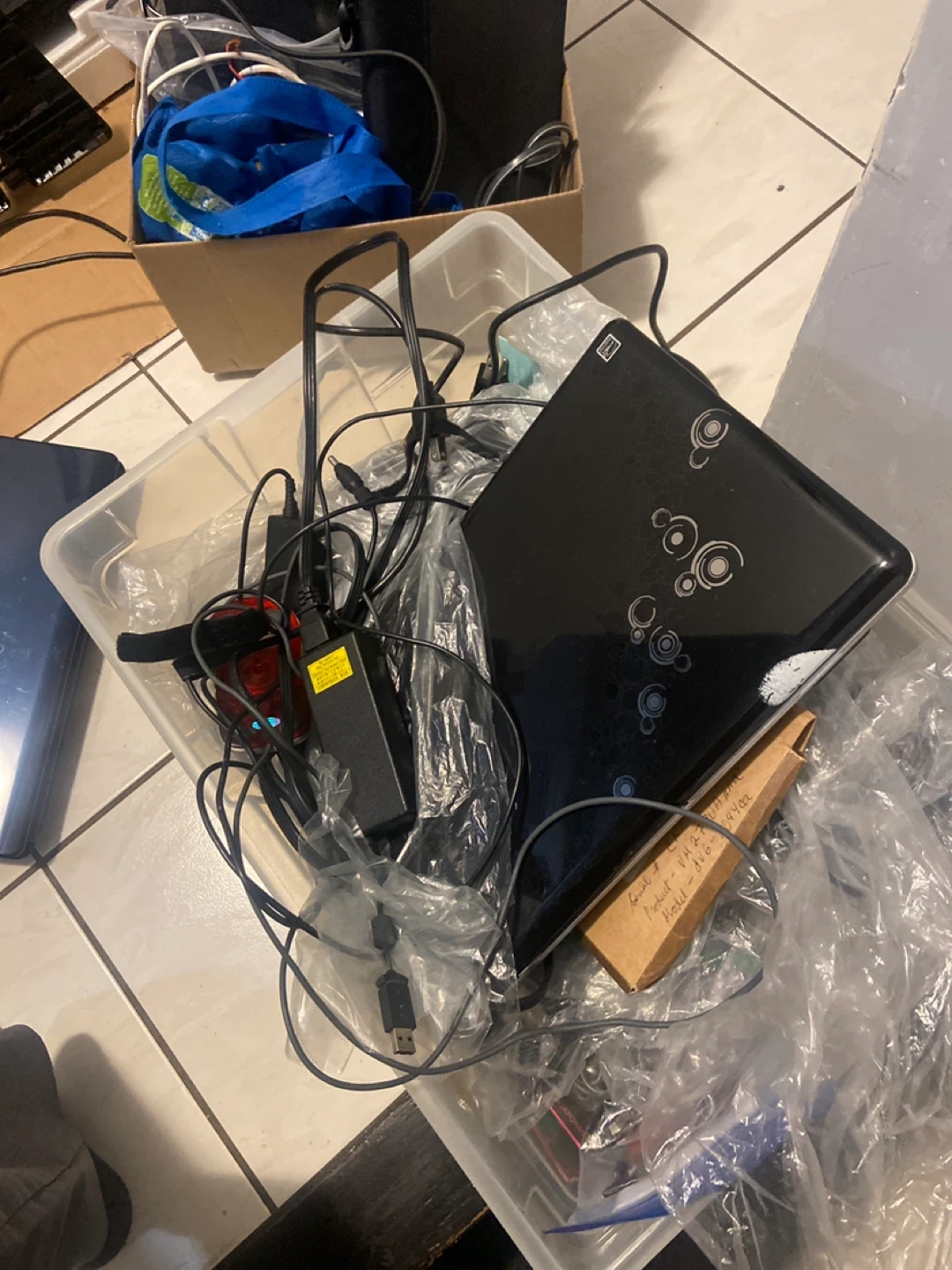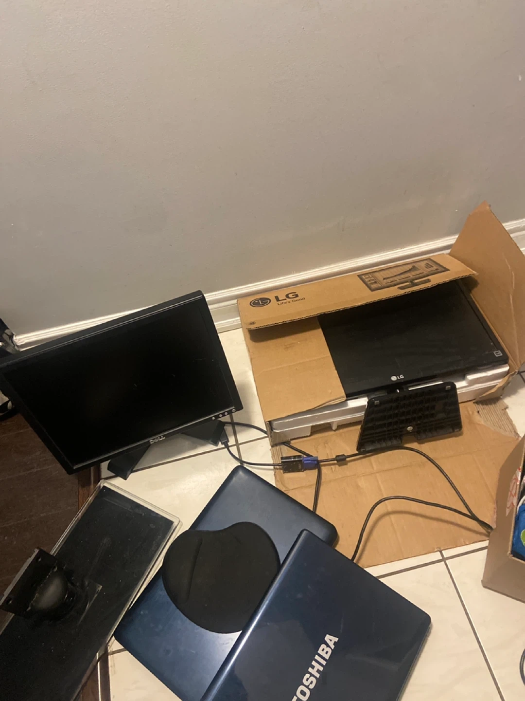 Bundle includes one Toshiba laptop and two monitors, one Dell and one LG. Also includes various cables and accessories. Great for parts and send back home