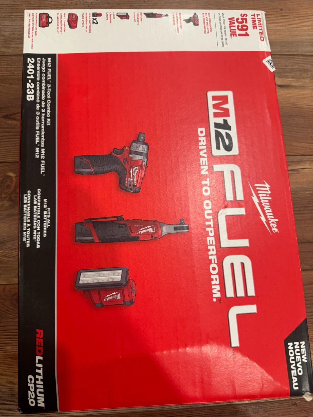 This is a Milwaukee M12 FUEL 3-Tool Combo Kit. It includes a screwdriver, ratchet, and light. The kit is compatible with all M12 batteries.