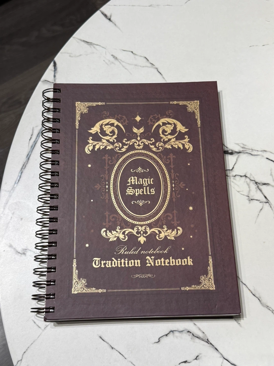This is a Magic Spells Tradition Notebook. It's a ruled notebook with a dark red cover. It has a spiral binding for easy page turning.