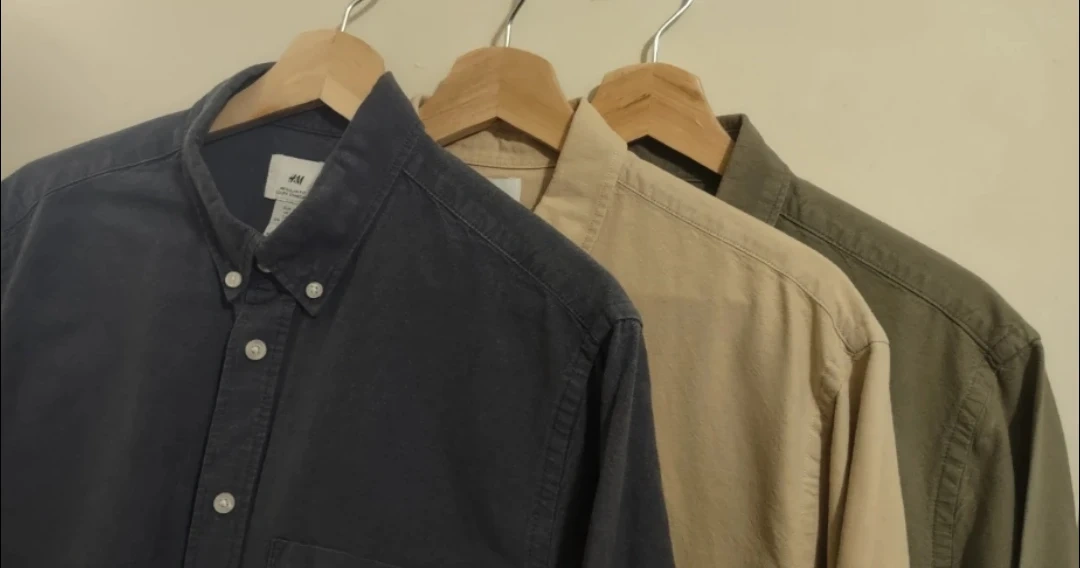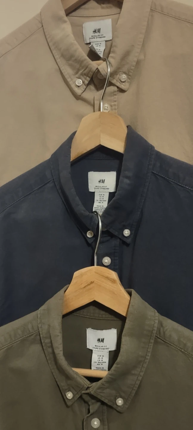 Selling a set of H&M Regular Fit Oxford shirts in size medium. The shirts come in three colours: beige, navy, and olive green. They're in great condition and ready for a new wardrobe!