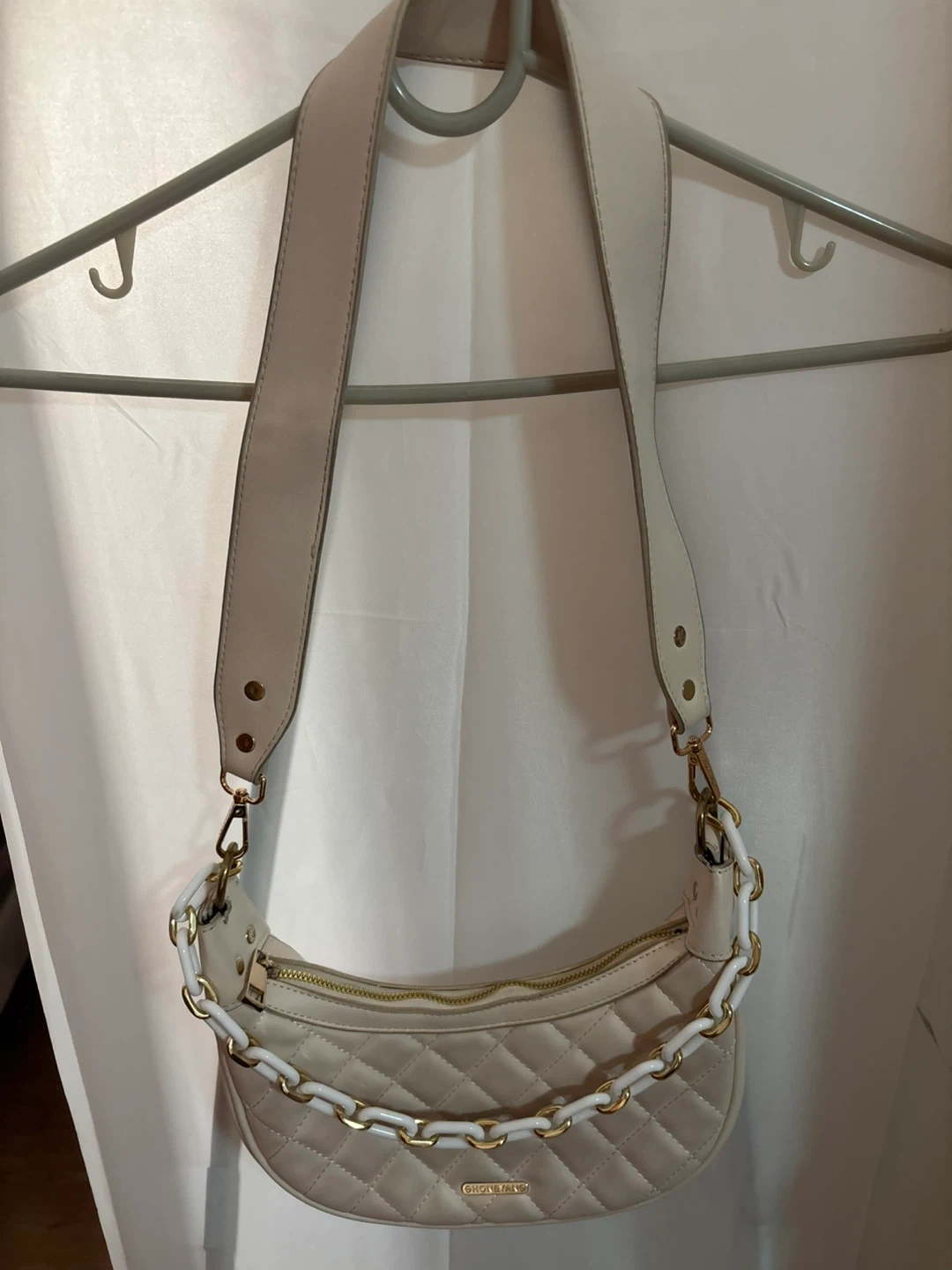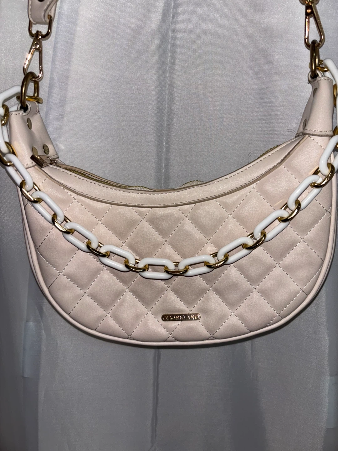 This stylish shoulder bag features a chic quilted design and a decorative chain strap with white and gold links. It's made of a smooth faux leather material and has a zippered closure. A great accessory for everyday use!