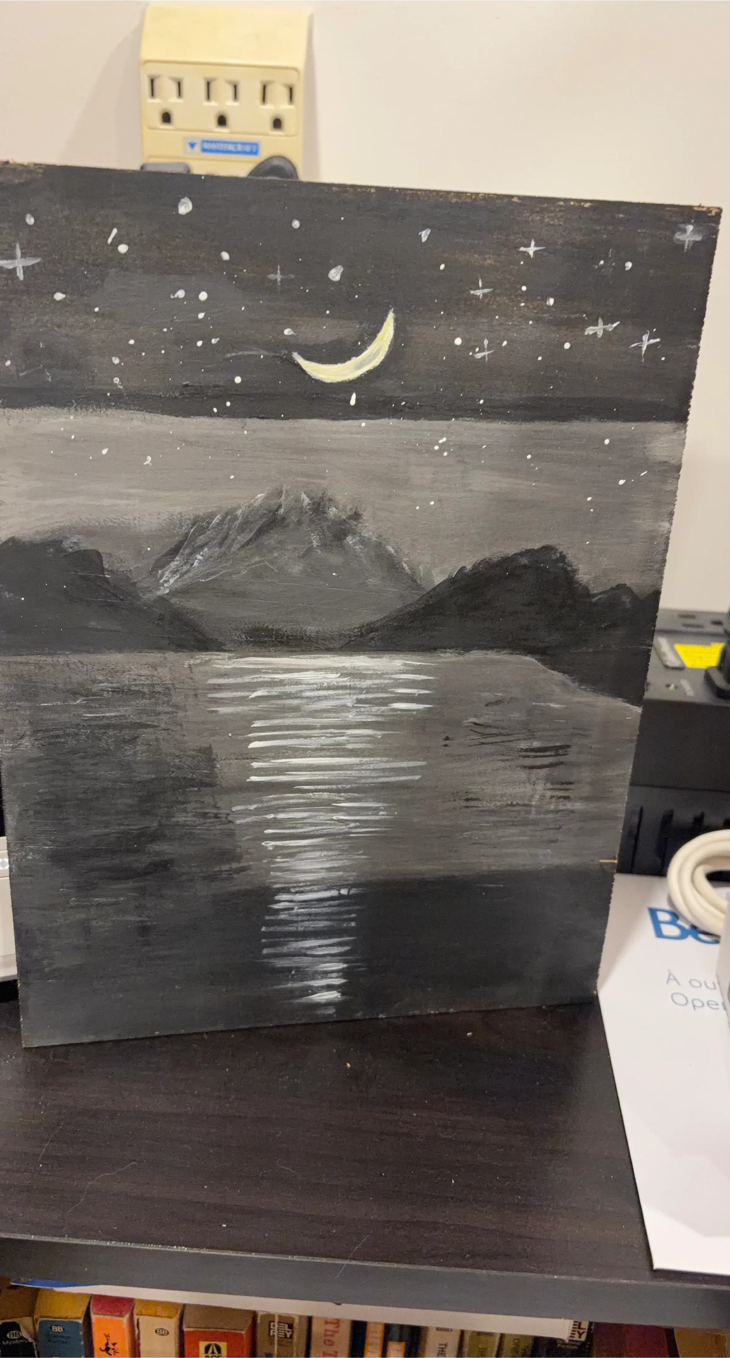 A unique painting depicting a moonlit night sky over mountains and water. It's done on a wooden board with acrylic paints. This piece features a crescent moon, stars, and the reflection of light on the water.