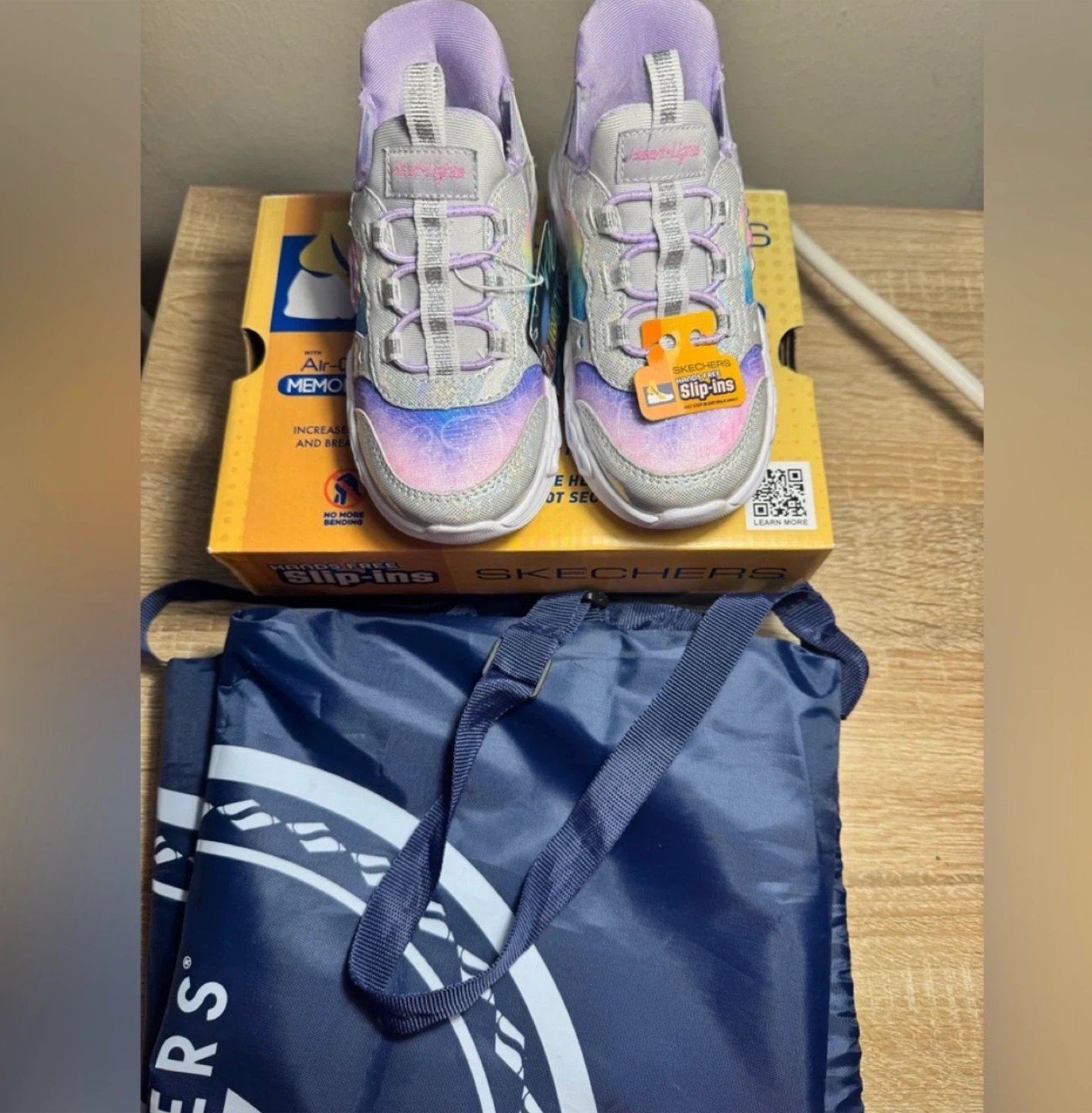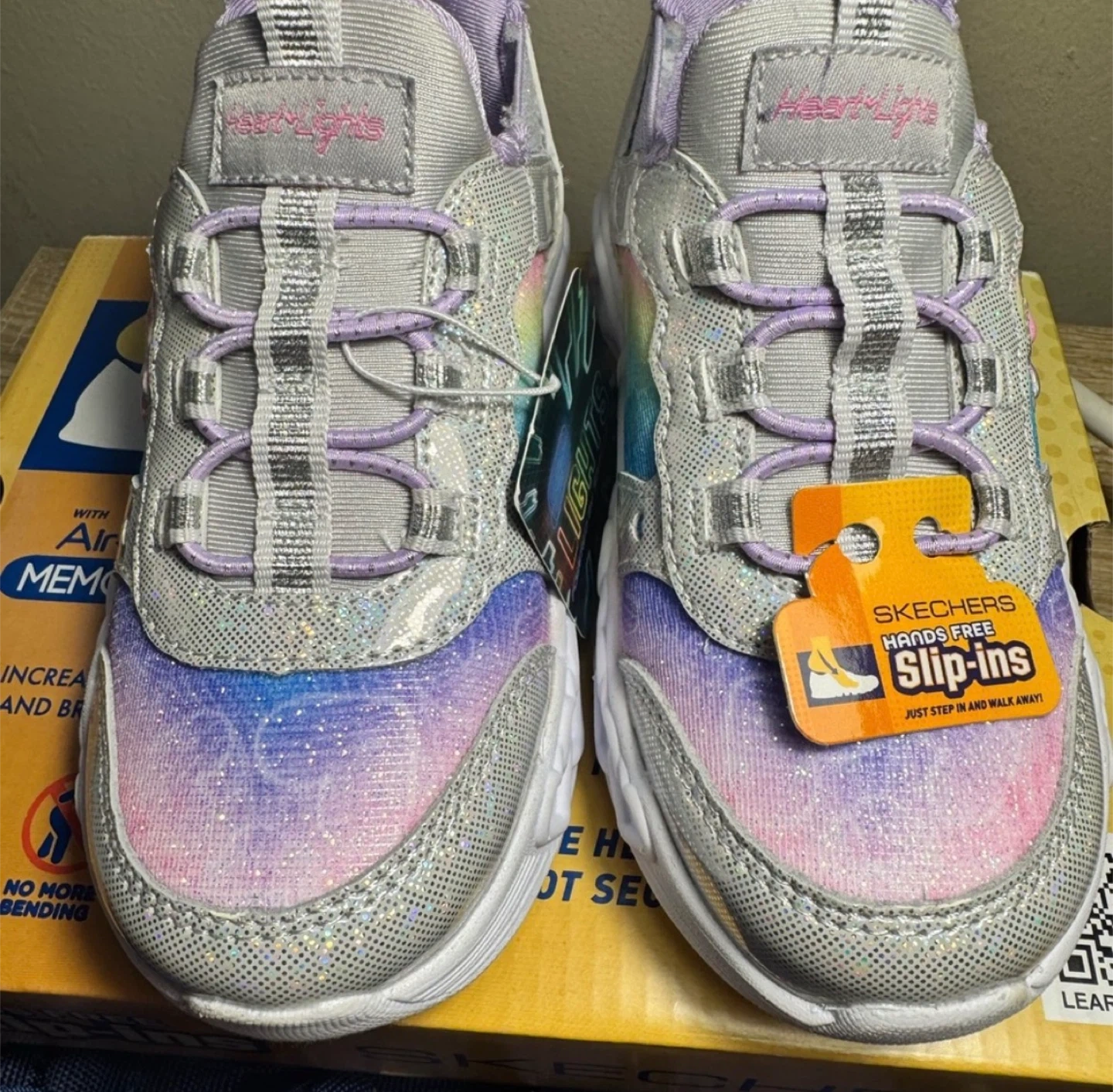 Skechers girls' sneakers with light up Slip-Ins technology. Grey with iridescent rainbow glitter details. Includes Skechers drawstring bag.