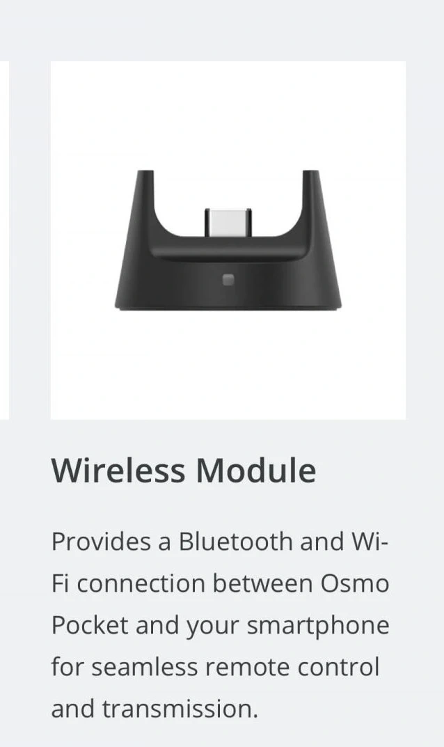 DJI Wireless Module: Adds Bluetooth/Wi-Fi for remote phone control and acts as a stable charging base.