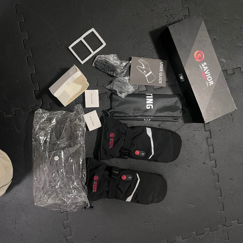Savior Heat battery-powered heated ski mittens, Size XXL. New open box - never used. Full kit included: heated mittens (pair), liner gloves, 2x rechargeable 7.4V battery packs, carrying bag, and user guide. 3 adjustable heat settings (high/medium/low). Far-infrared carbon fiber heating elements cover entire back of hand and fingertips. Heats up in seconds. Up to 6+ hours on low setting. Reflective strips for night visibility. Adjustable wrist belt. Waterproof and windproof outer shell. Perfect for skiing, snowboarding, snowmobiling, or anyone with cold hands. Retails $130+.