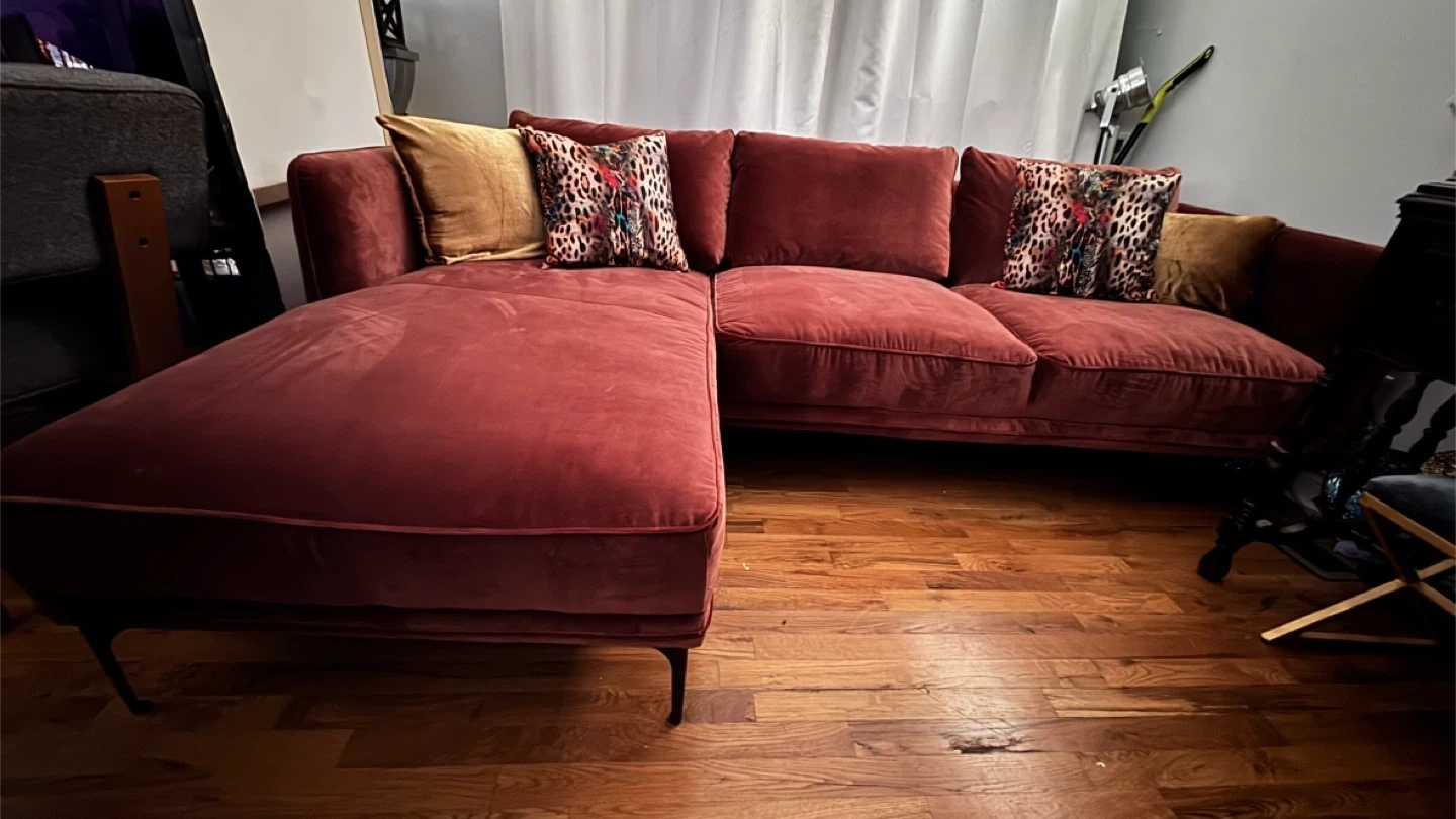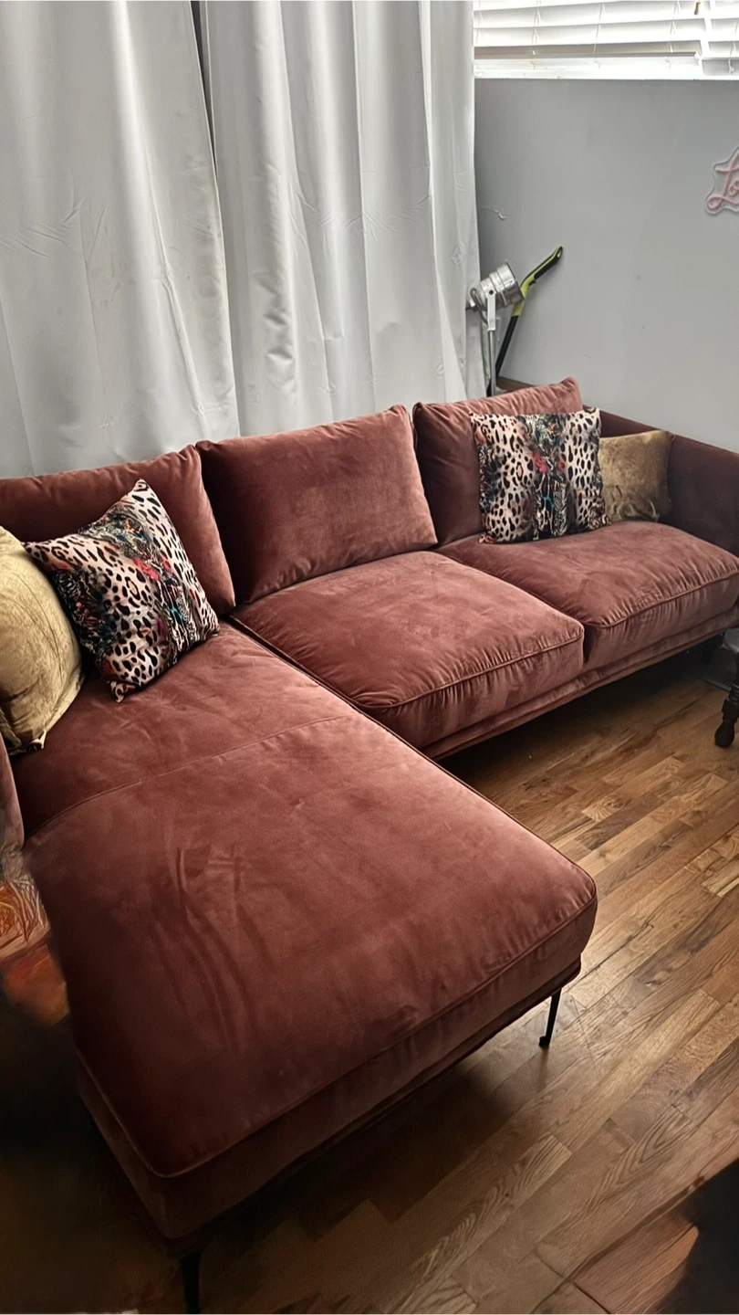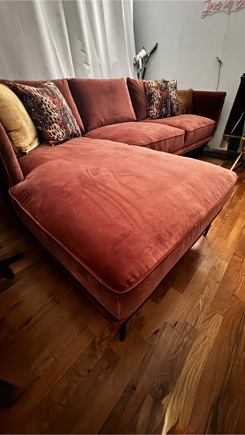 Comfortable velvet sectional sofa in a cinnamon color. This piece includes multiple throw pillows, some with a (leopard print design. Not included ) It offers ample seating space. Less than a year old.