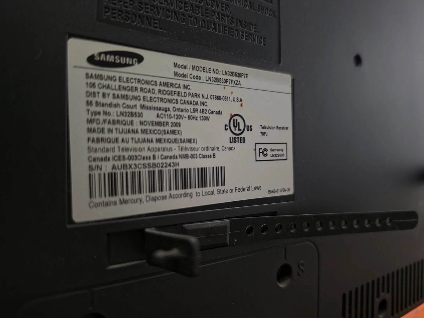 Samsung 32-inch flat screen TV. Model LN32B530P7F. Manufactured November 2009. AC 110-120V, 60Hz, 130W. Works well!