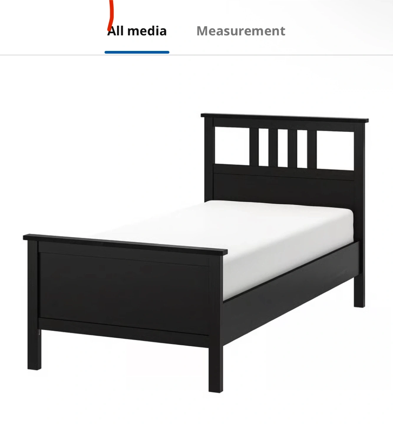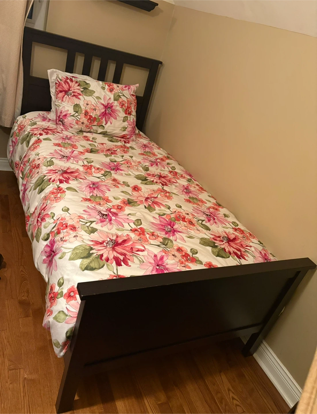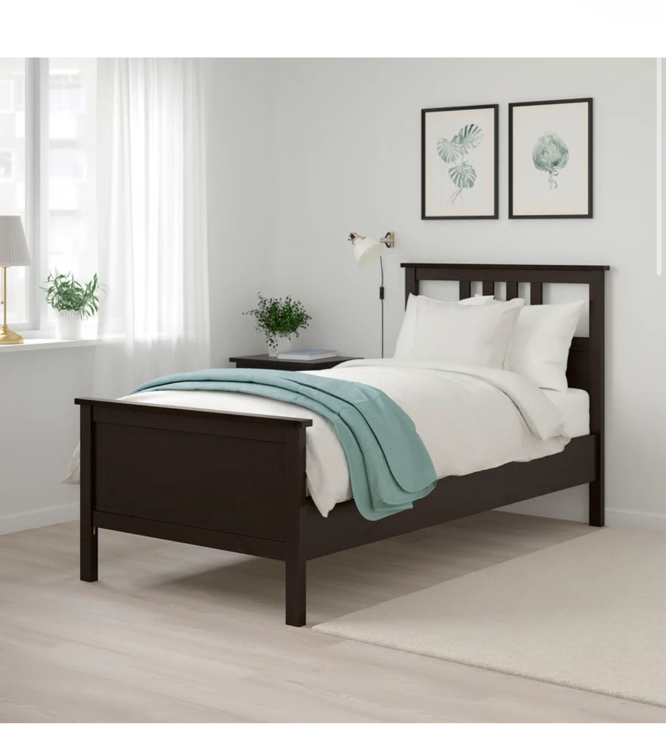 A twin bed frame from IKEA's HEMNES series. It's made of solid wood with a black finish. This bed frame is a good choice for a child's room or guest bedroom. Retails for $299. I’m including the mattress. https://www.ikea.com/ca/en/p/hemnes-bed-frame-black-brown-30249551/