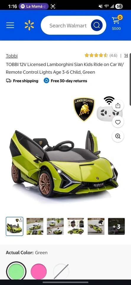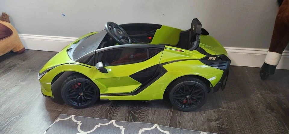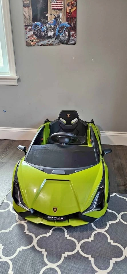 Awesome green Lamborghini Sian ride-on car for kids. This 12V electric car has remote control. Great for little ones, ages 3-6. Super cool for cruising around.