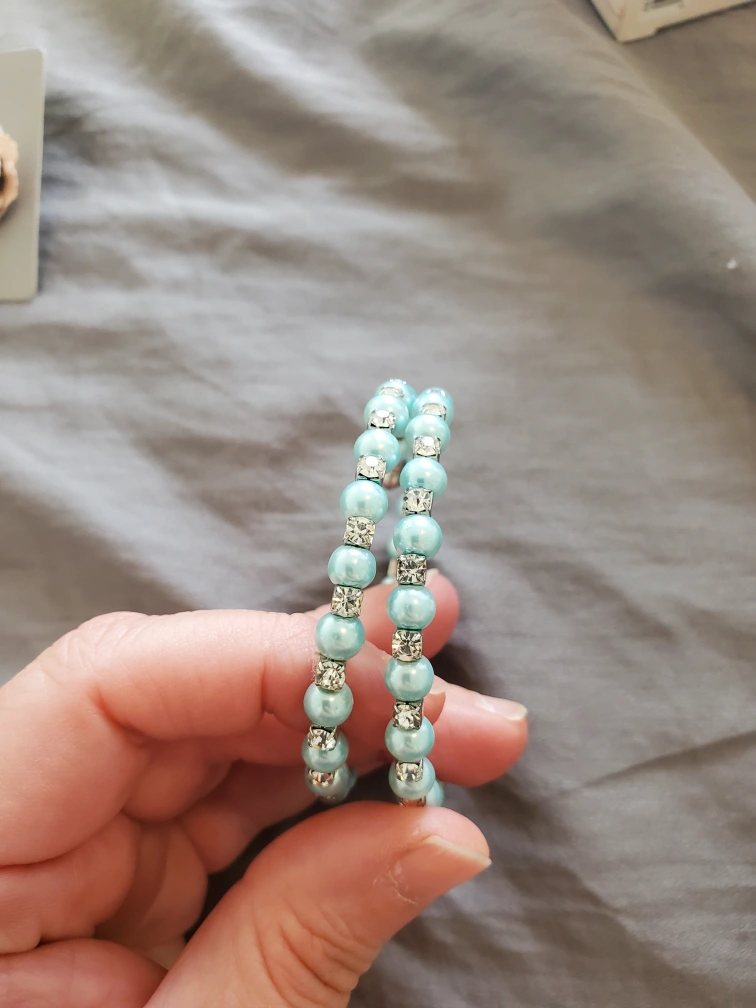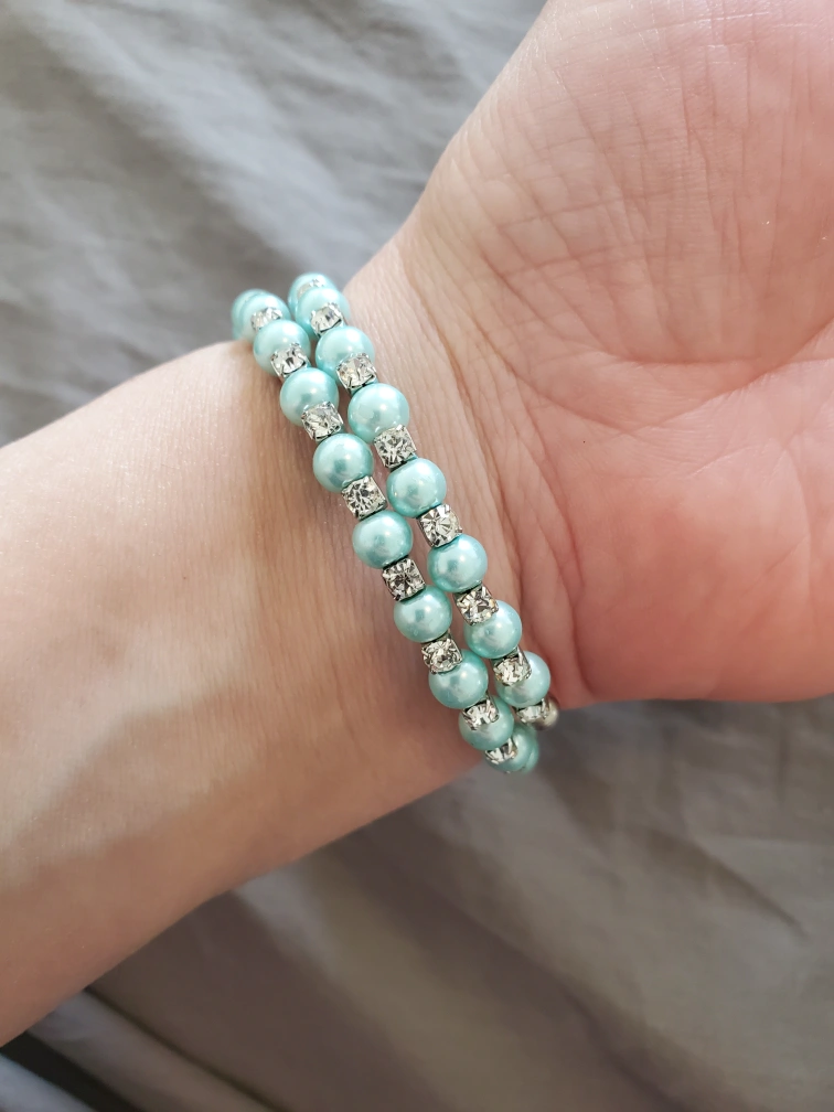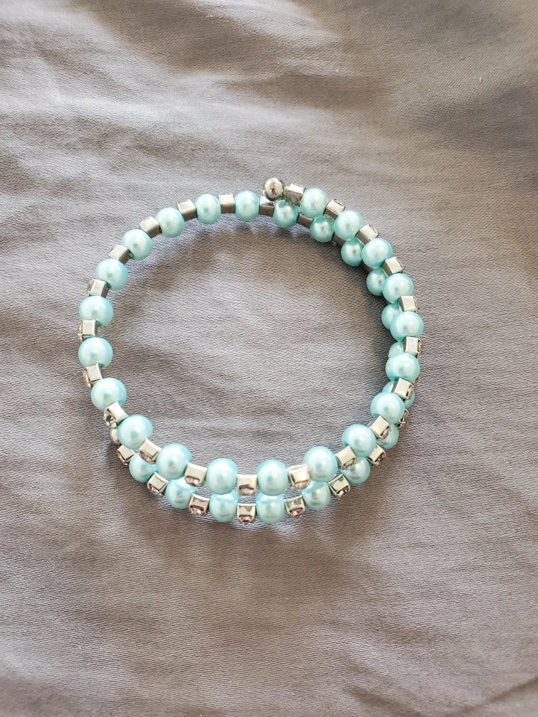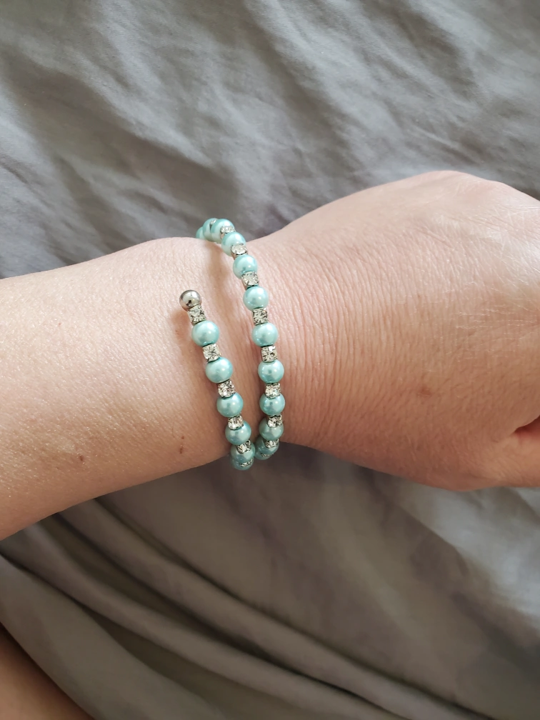 A lovely blue beaded coil bracelet featuring faux pearls and sparkling rhinestone accents. This wrap-around bracelet is designed to fit most wrists comfortably. It's an easy-to-wear accessory that adds a pop of colour to any outfit. The bracelet's design makes it simple to slip on and off!