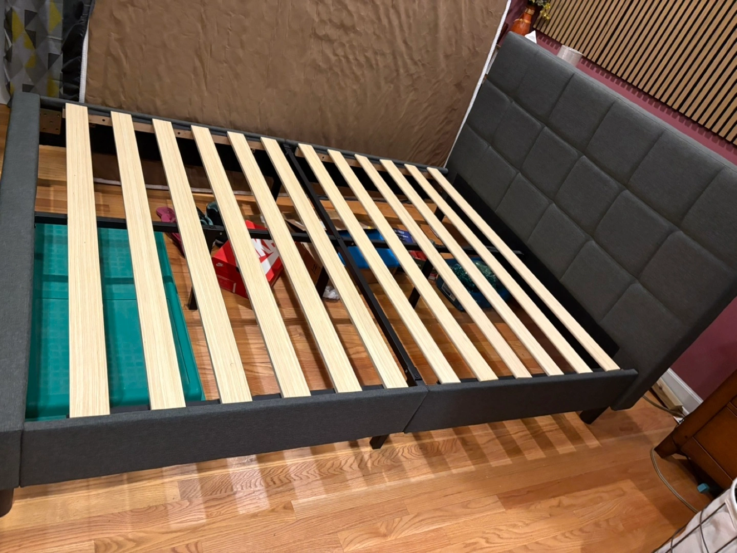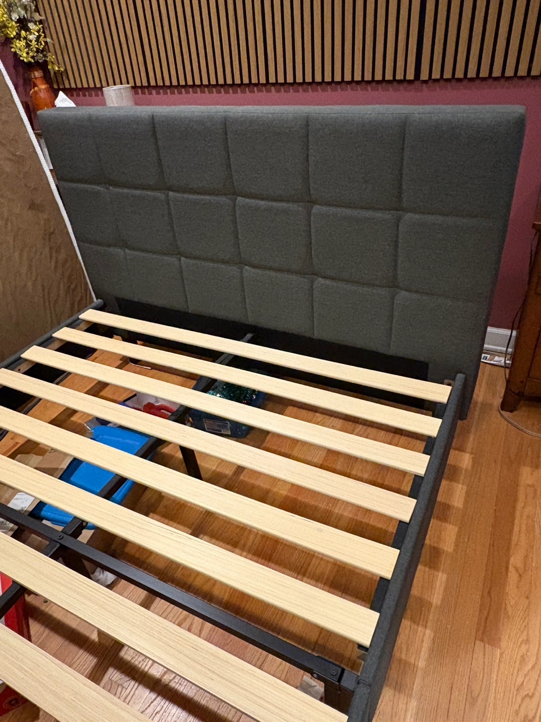 Queen size platform bed frame (with headboard) Grey fabric upholstery. Wood slat support. No box spring needed.