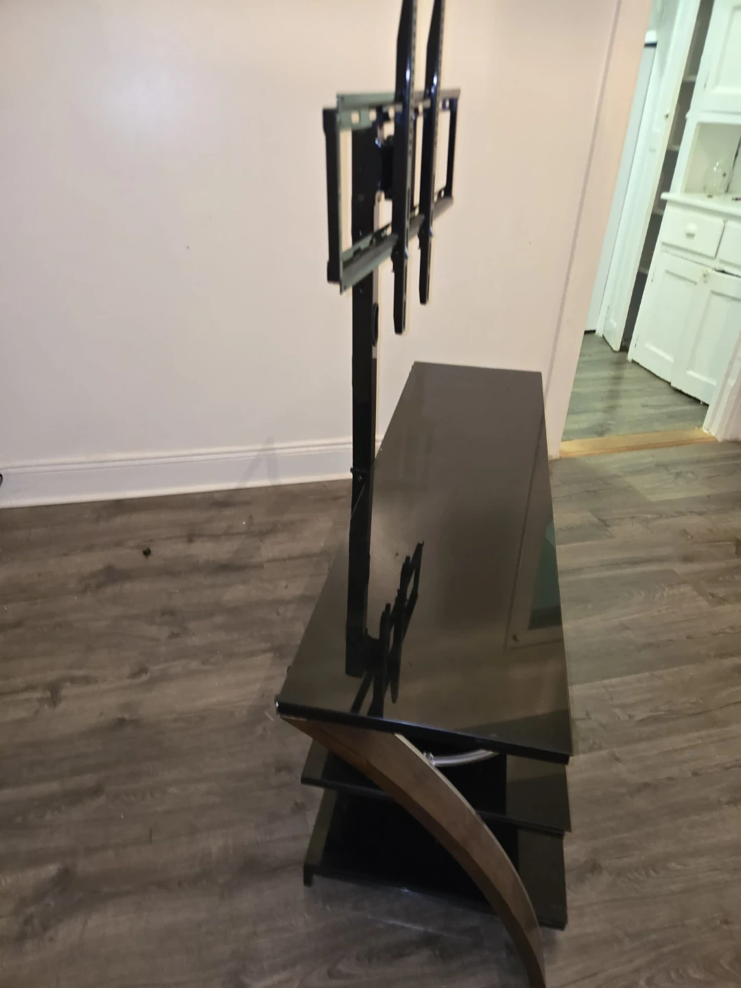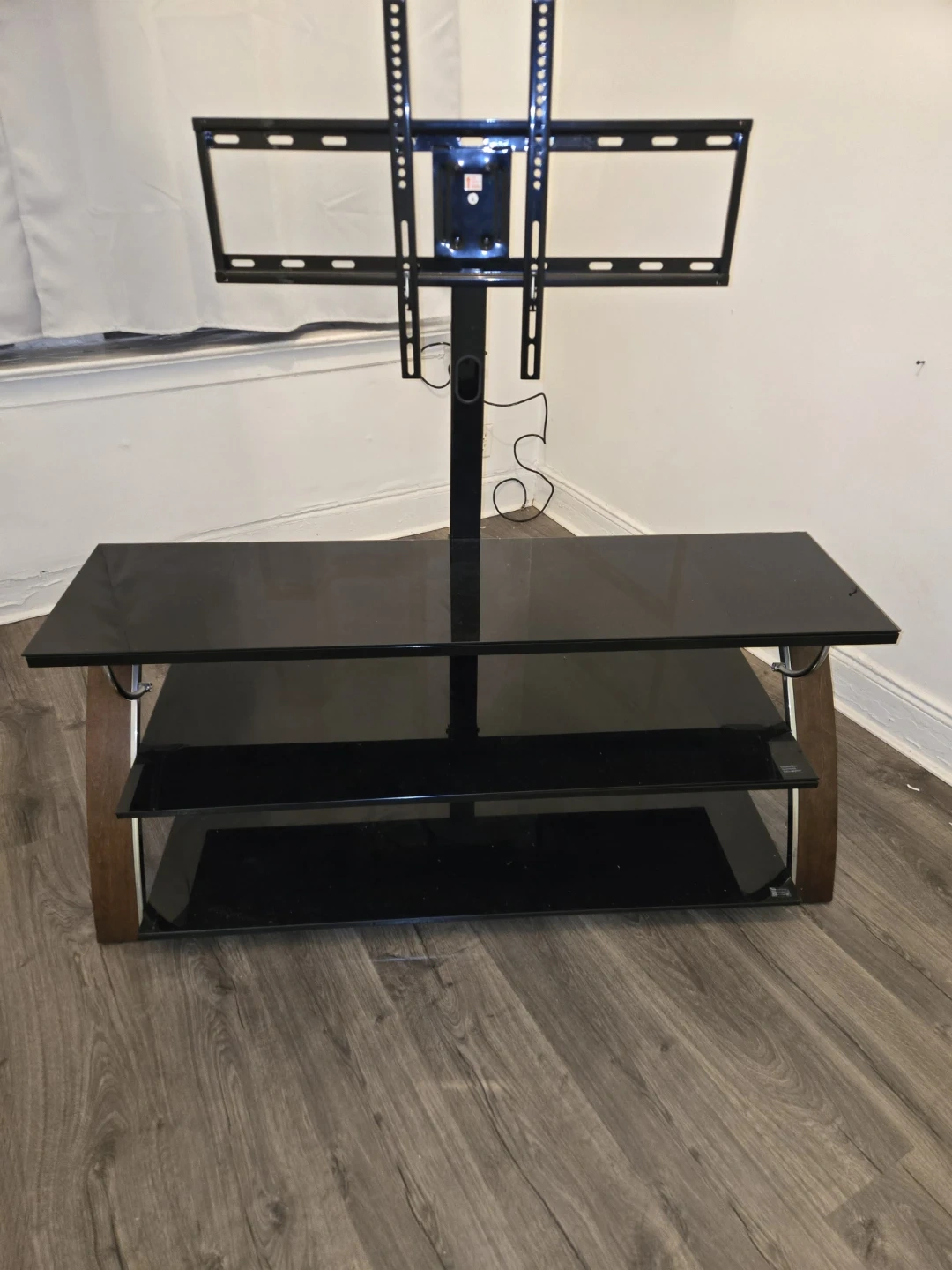 Black glass TV stand with a TV mount. It has three shelves for media components. The stand's frame has a modern curved design. This stand is suitable for most living rooms.