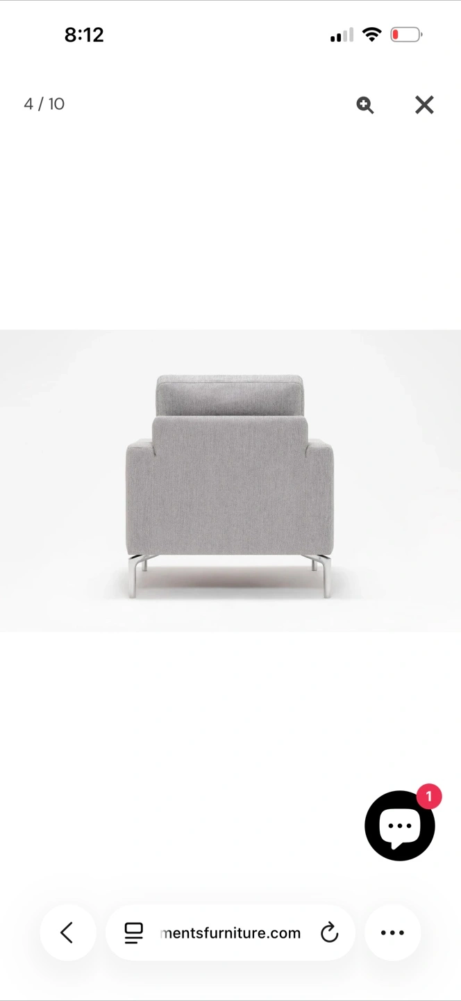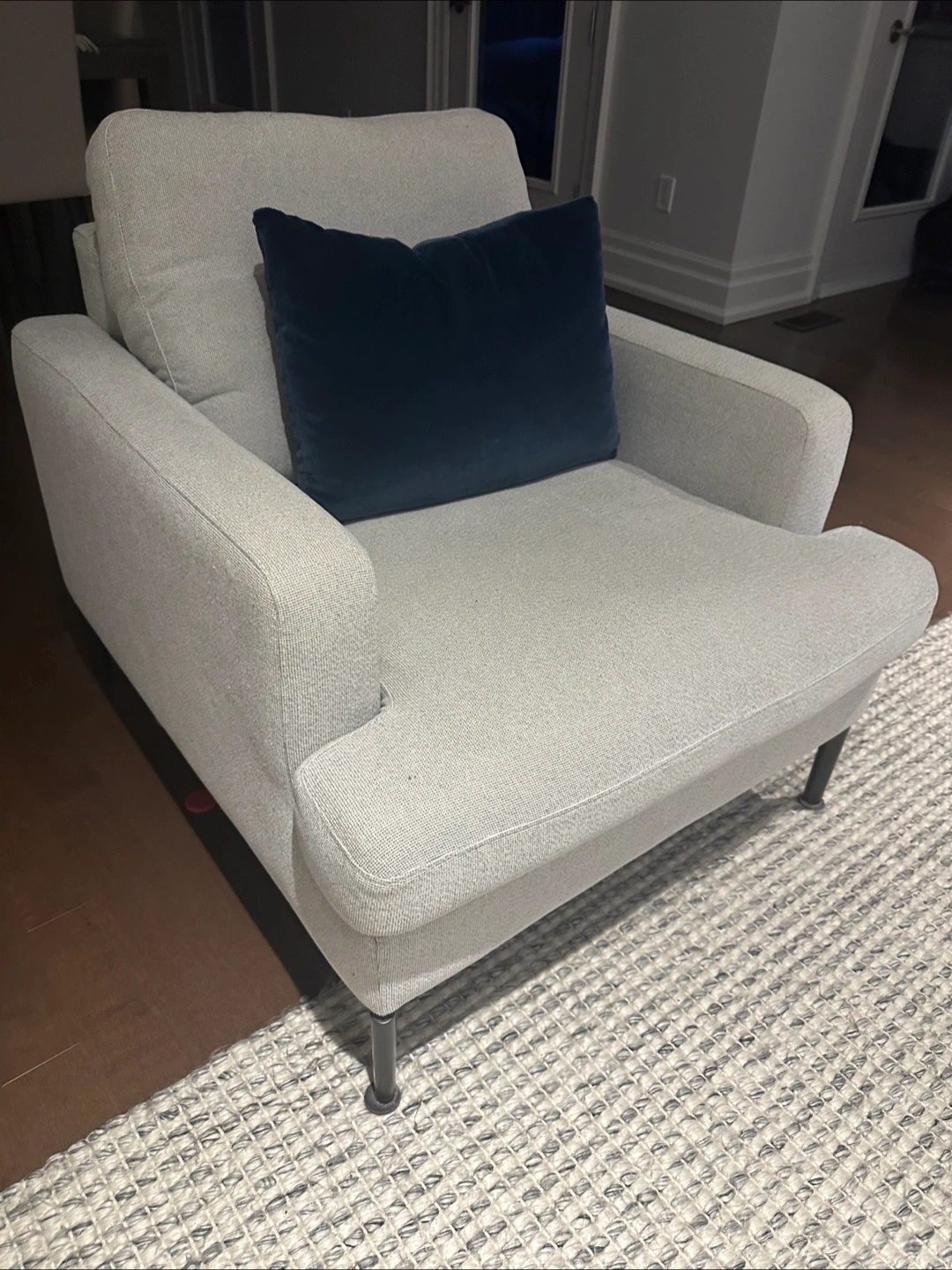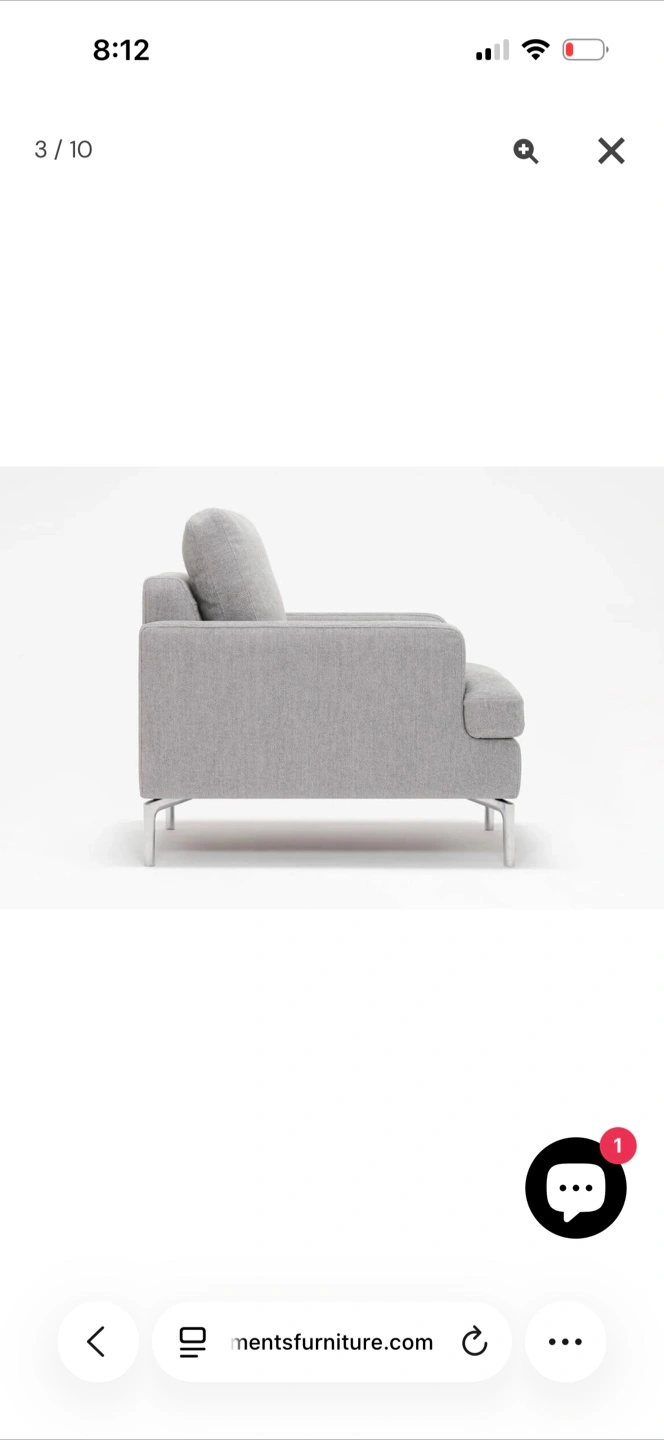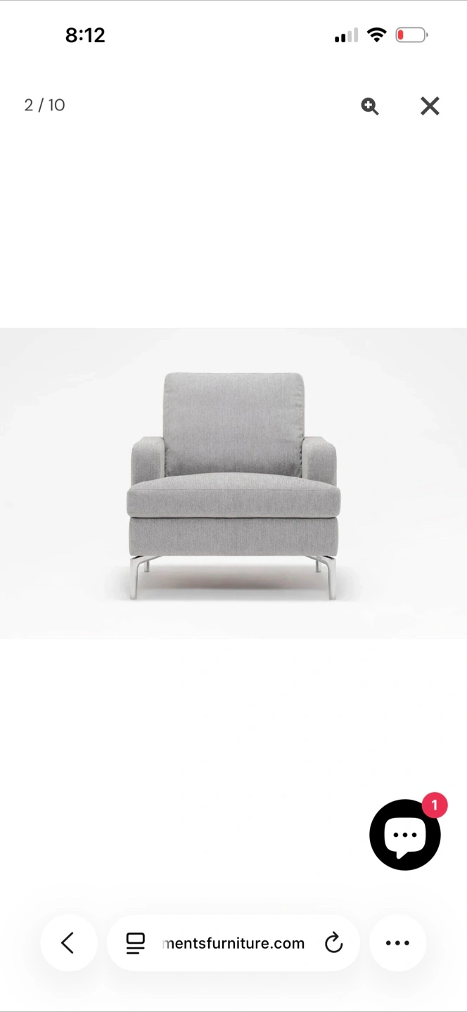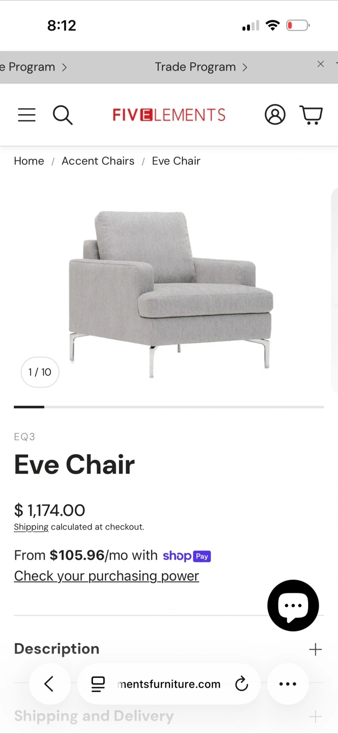 This FIVE ELEMENTS Eve Chair is upholstered in a light grey fabric. It features a modern design with clean lines and silver-toned legs. The chair's dimensions are approximately 30 inches wide, 32 inches deep, and 33 inches high. It's a comfortable accent chair for any living space.