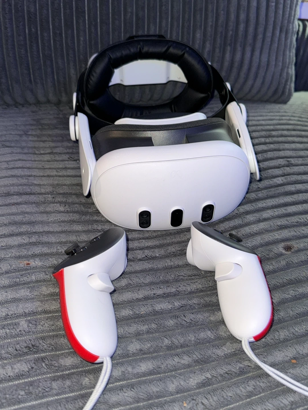 This is a Meta Quest 3 headset with its accompanying controllers. It's designed for immersive virtual reality aswell as augmented reality experiences.
