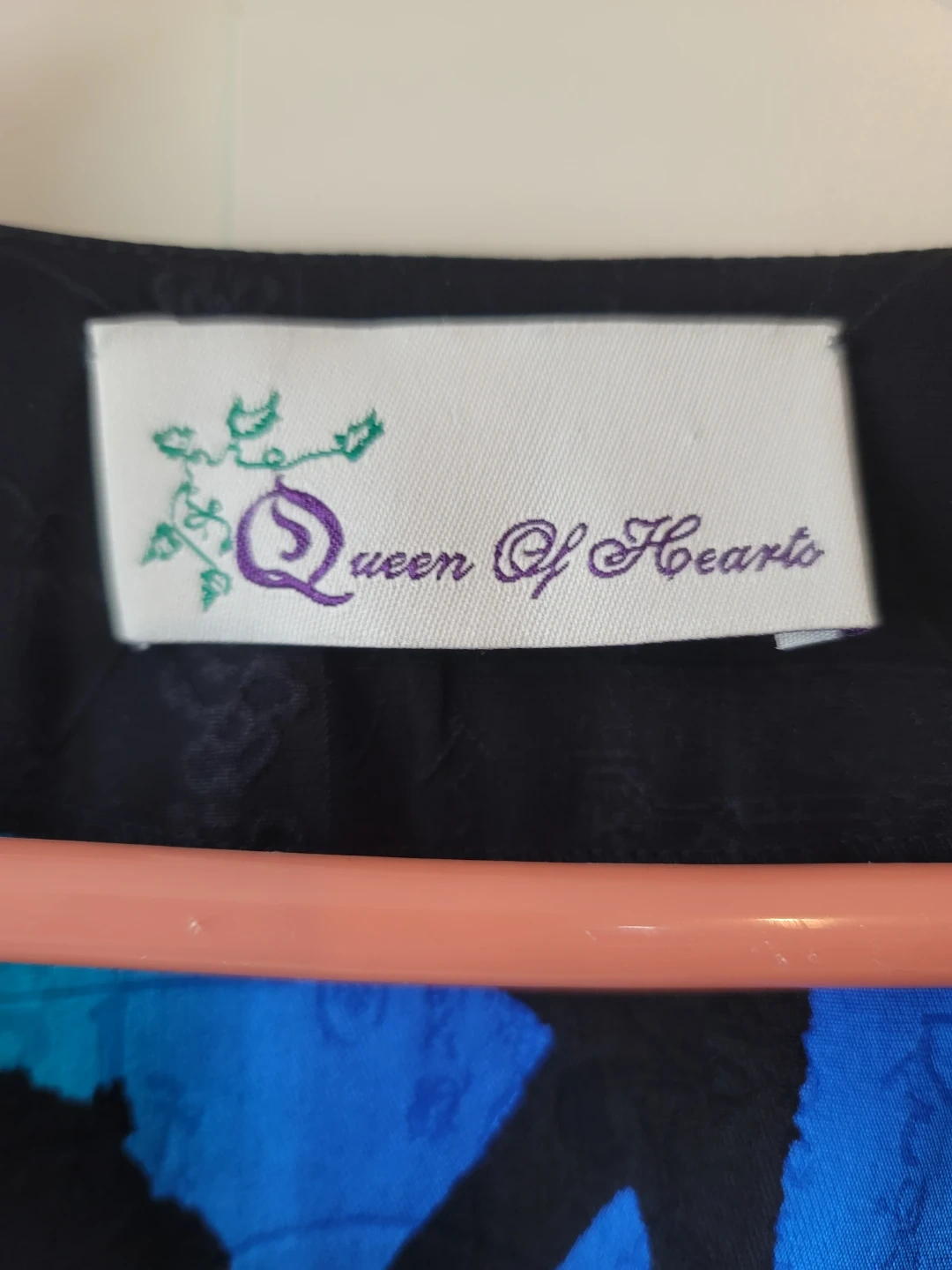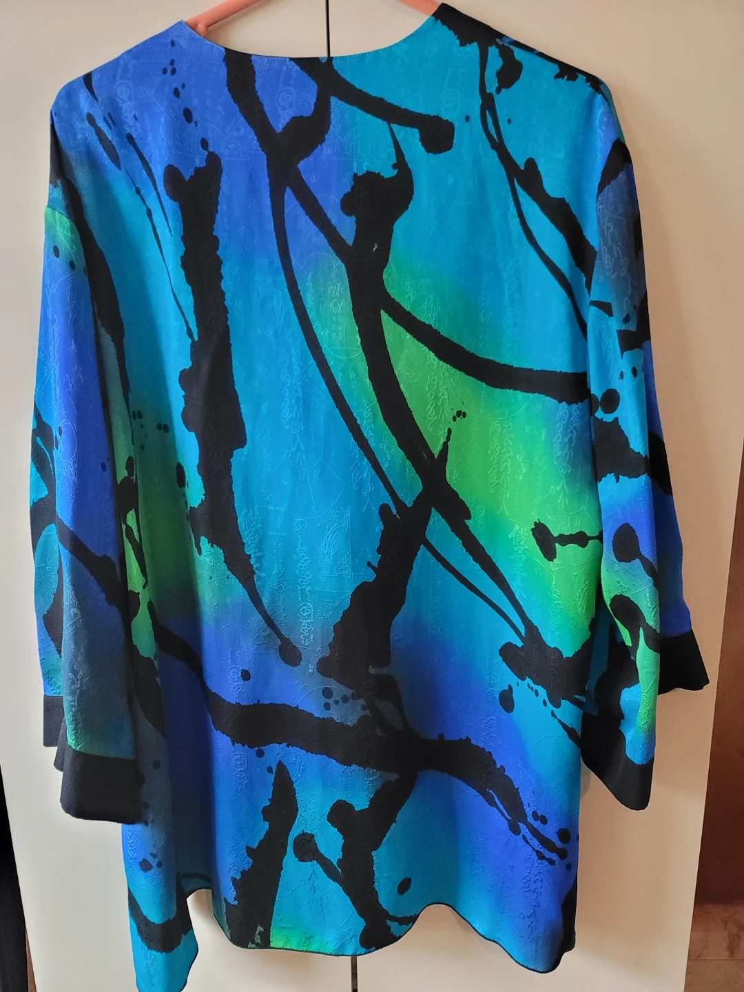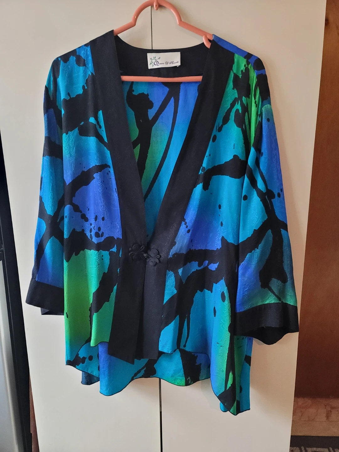 Queen of Hearts kimono-style jacket. Features a vibrant blue, green, and black abstract print with a black trim and decorative buttons. Lightweight fabric.