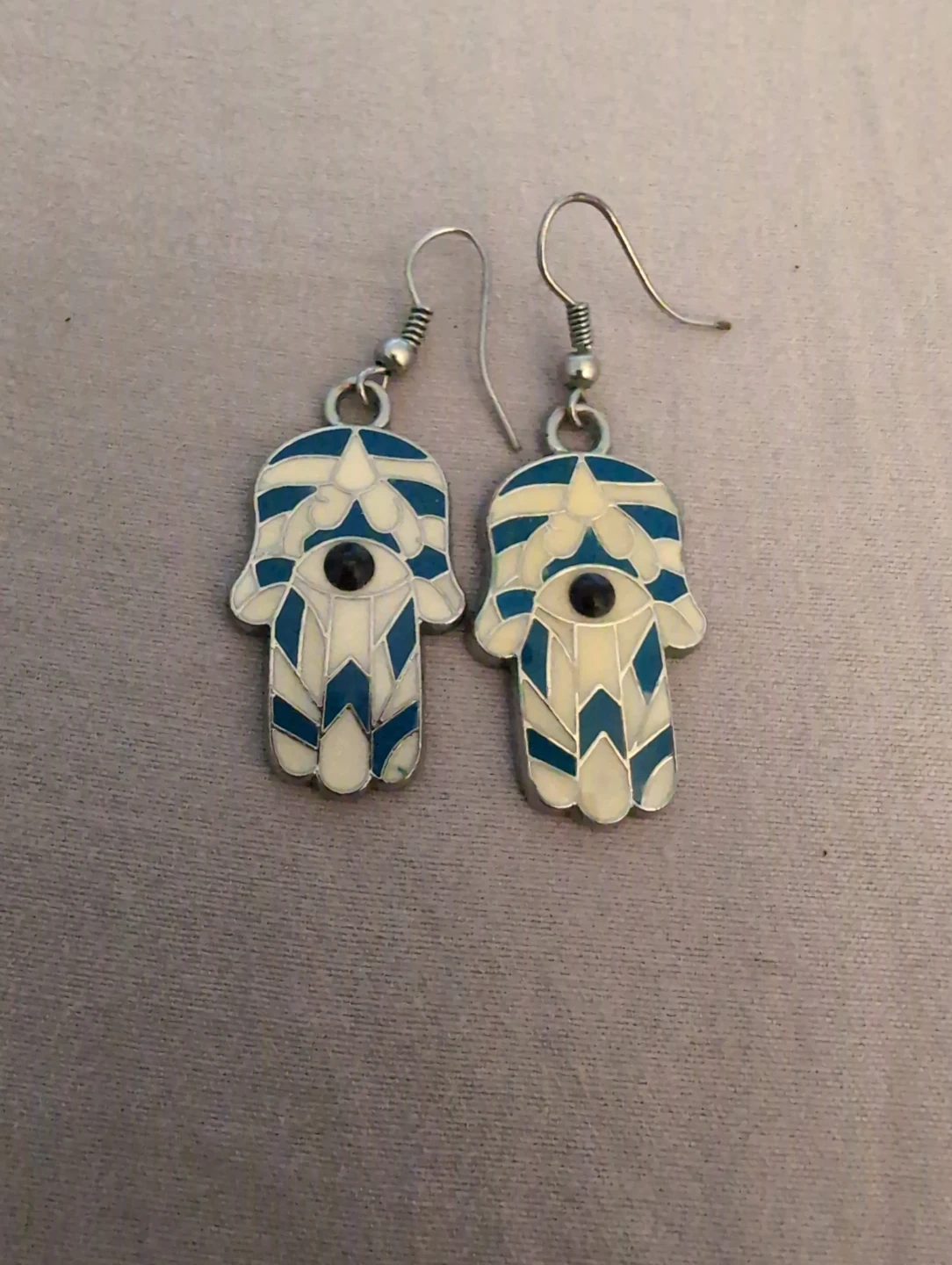Cute pair of Hamsa hand earrings! They feature a blue and white design with a black centre. Perfect for adding a touch of style to any outfit