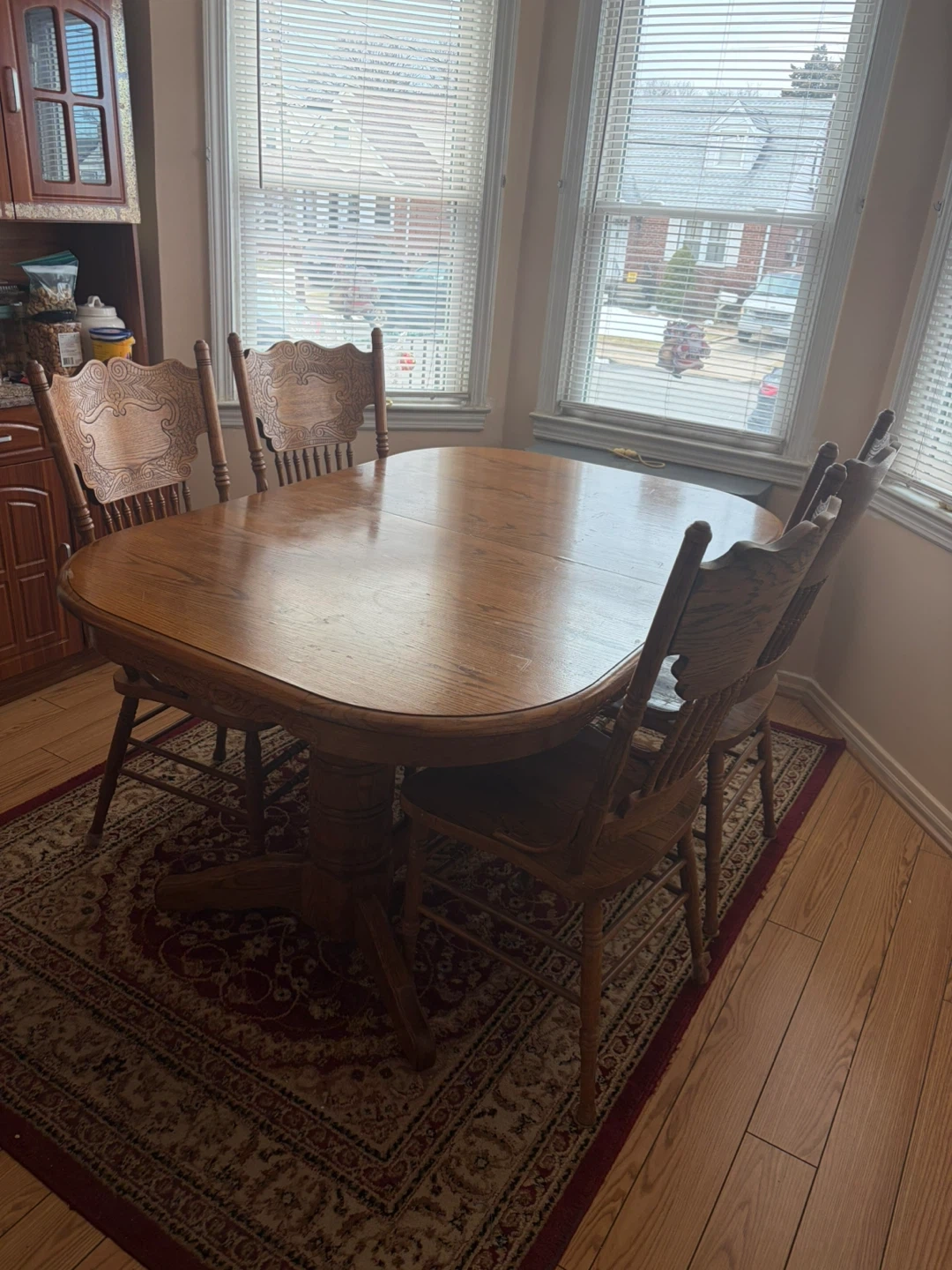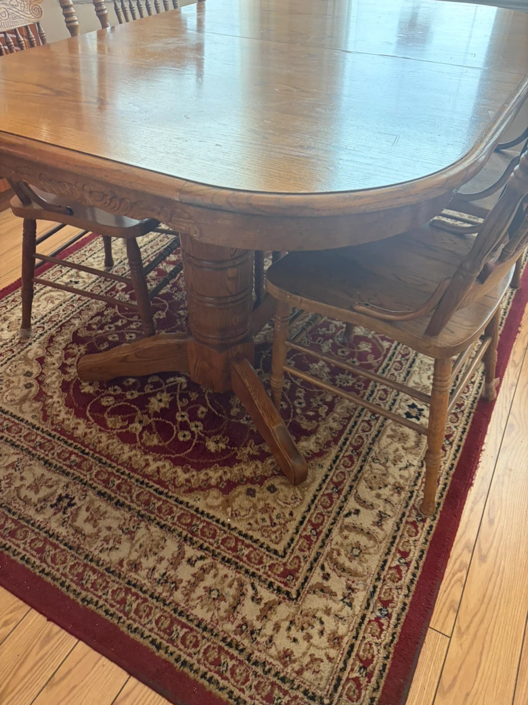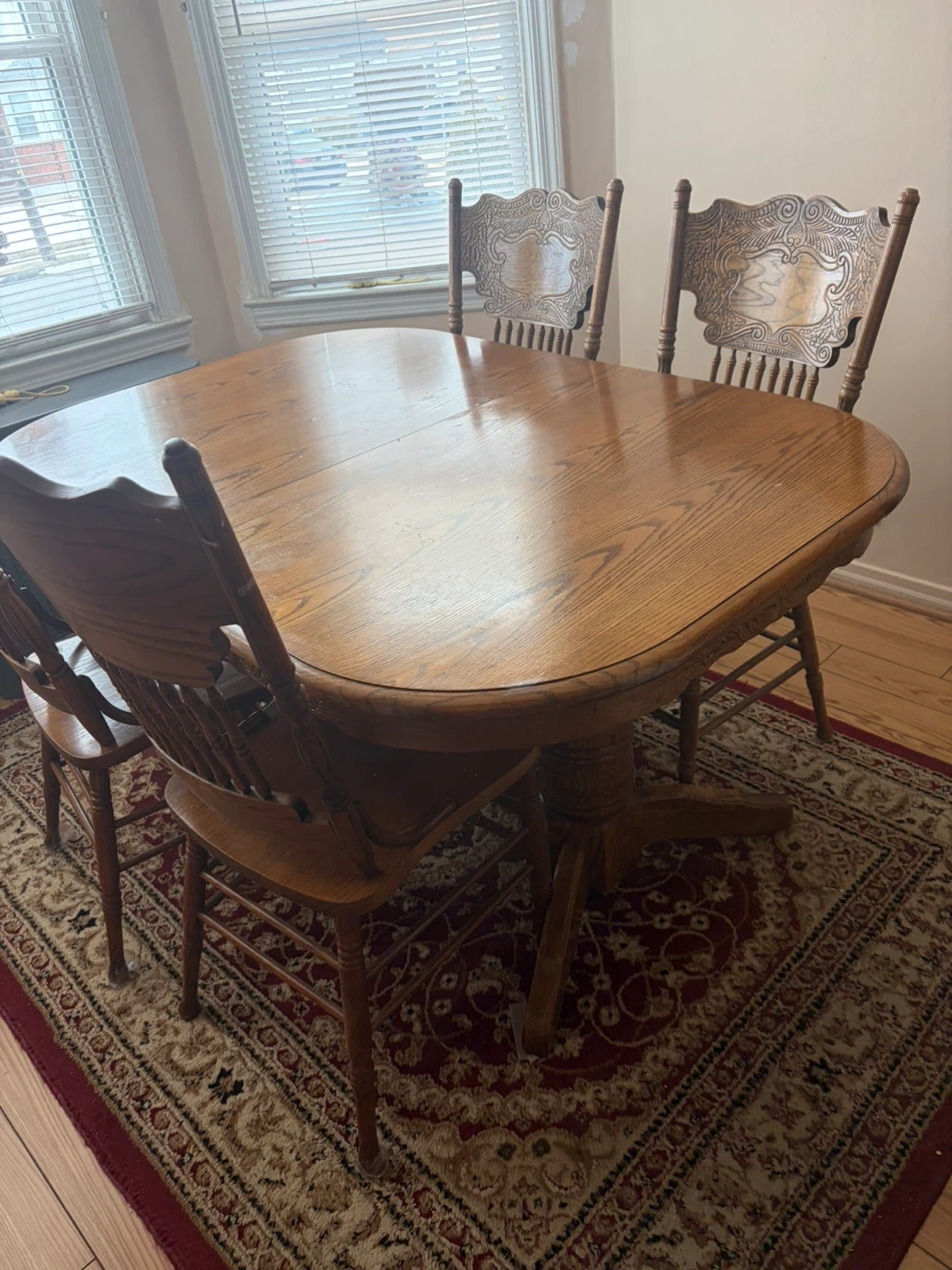 This wooden dining table and chairs set features a sturdy pedestal base and intricately carved chair backs. It's made of solid wood with a warm oak finish. This set's classic design makes it a great addition to any dining area. It seats four people comfortably.