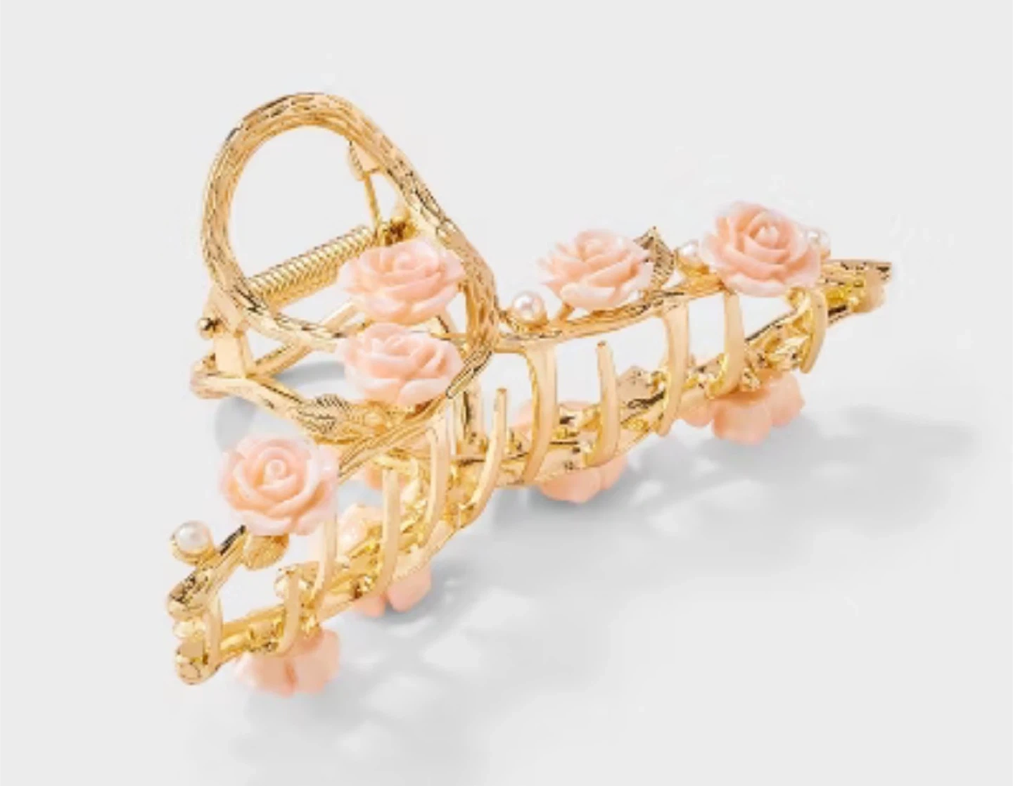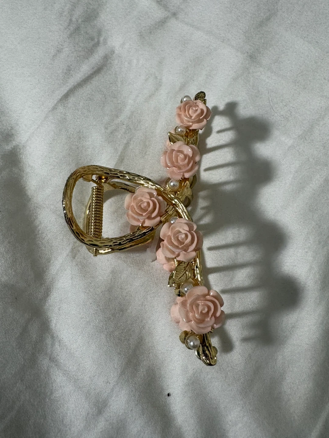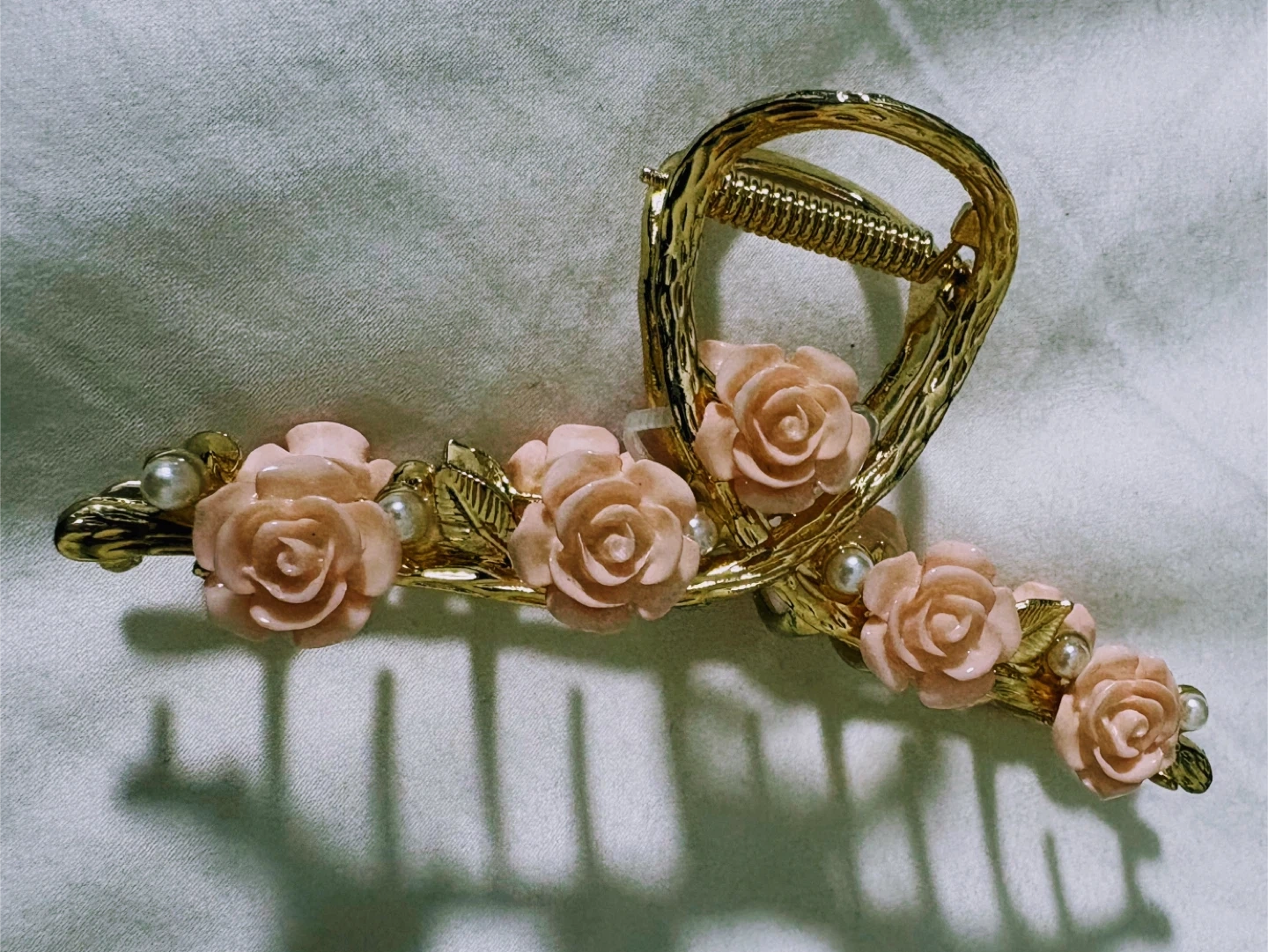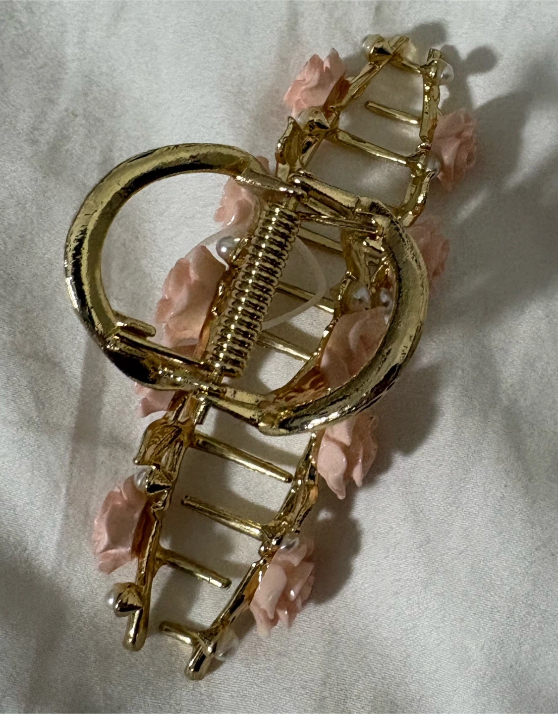 This stylish claw clip features a gold-tone metal design adorned with delicate pink rose accents and small pearl details. It's perfect for securing updos or adding a decorative touch to your hairstyle. The clip's strong spring mechanism ensures a secure hold.