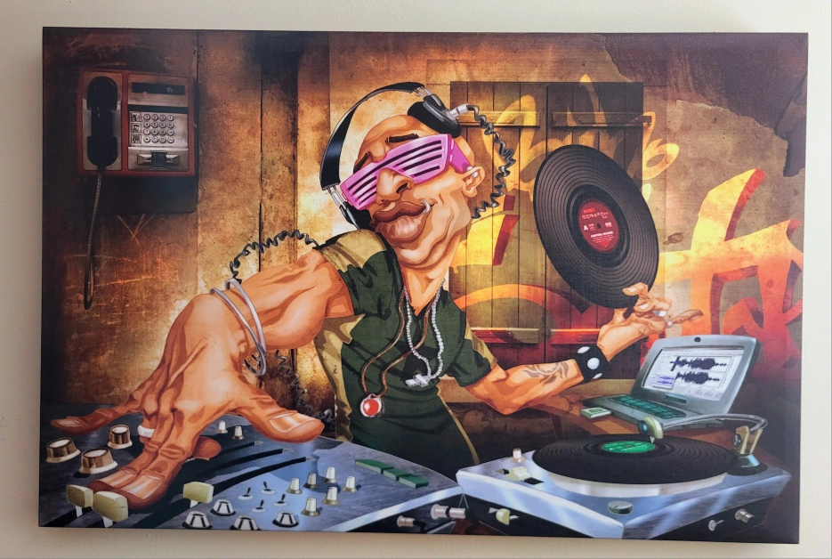Canvas wall art of a DJ with a record player, headphones, and a microphone. The DJ is wearing pink sunglasses. The art is in a colorful, graffiti-like style.